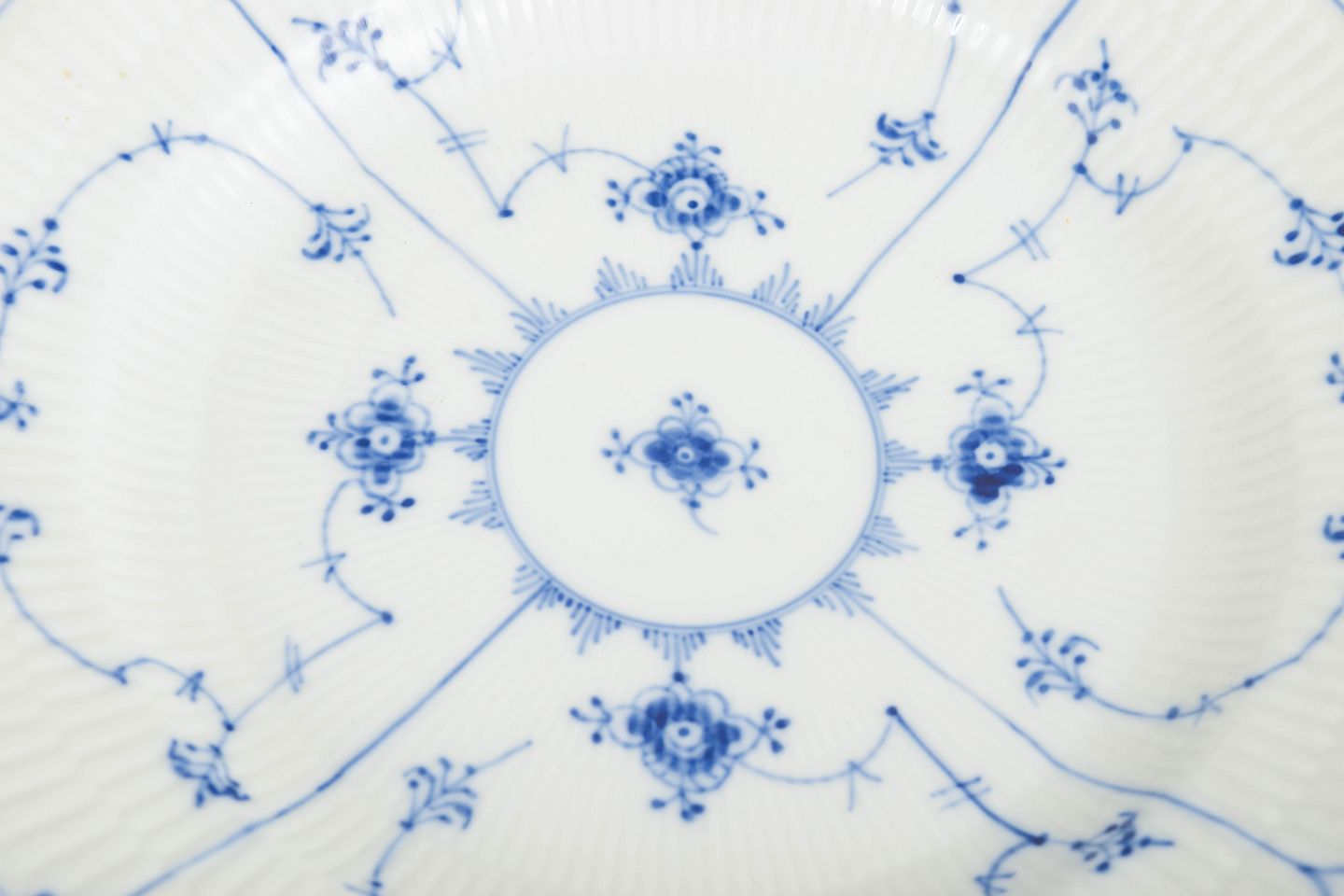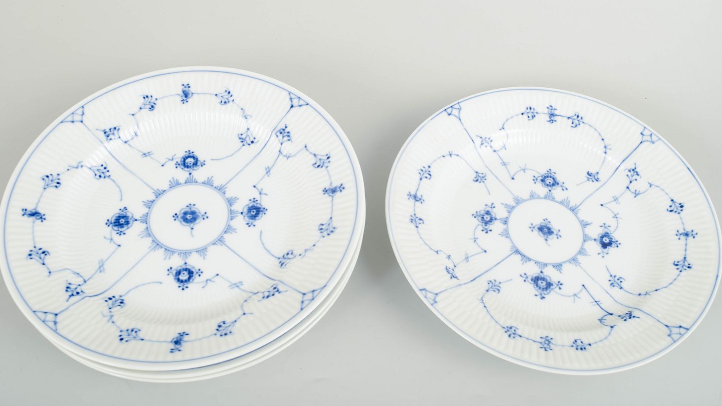 Royal Copenhagen Musselmalet Riflet, sæt af fire middagstallerkener.Sæt af fire middagstallerkener i håndmalet porcelæn fra Musselmalet Riflet med klassisk underglasurdekoration i koboltblå. Model 1/175. Første sortering. Hver tallerken måler 26 cm i diameter. Fremstillet 1967.