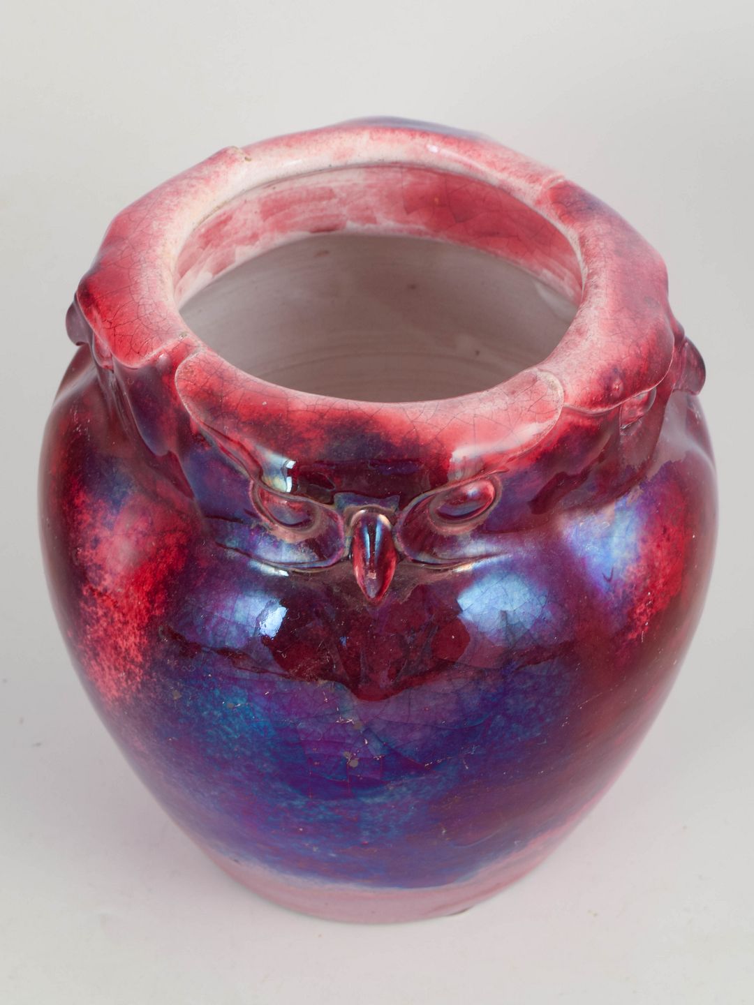 Karl Hansen Reistrup for Kähler, uglevase. Lustreglasur.Unika uglevase i kunstkeramik med ugledekoration langs randen i relief og iriserende glasur i røde og blå nuancer. Fremstillet hos Kähler i 1890’erne under Karl Hansen Reistrups kunstneriske ledelse fra 1888.