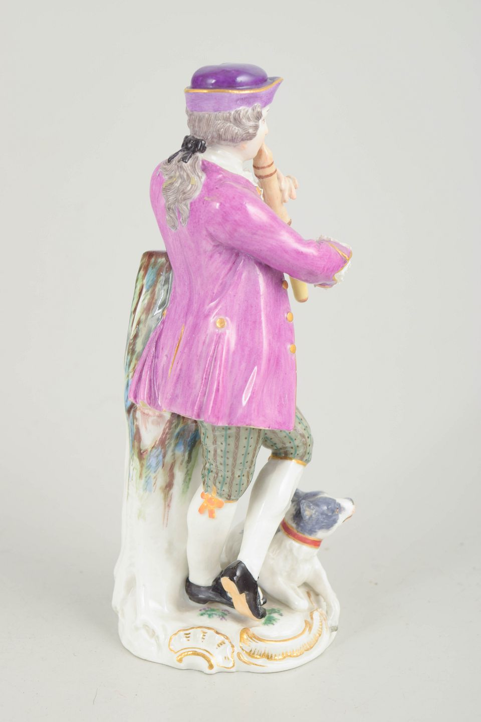 Meissen figur, adelsmand med fløjte og hund.Porcelænsfigur forestillende en stående adelsmand med fløjte ved en træstub og en lille hund ved fødderne. Udført i håndmalet porcelæn med polykrome farver og forgyldte detaljer. Model 2722. Første sortering. Mærket med Meissens krydsede sværd. Baseret på en model af Johann Joachim Kaendler.