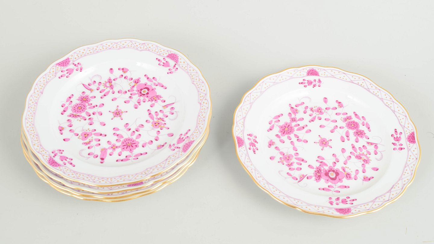 Meissen, "Pink Indian" sæt af fem frokosttallerkener.Sæt af fem salattallerkener i håndmalet porcelæn med blomsterdekoration i rosa nuancer og forgyldt kant.