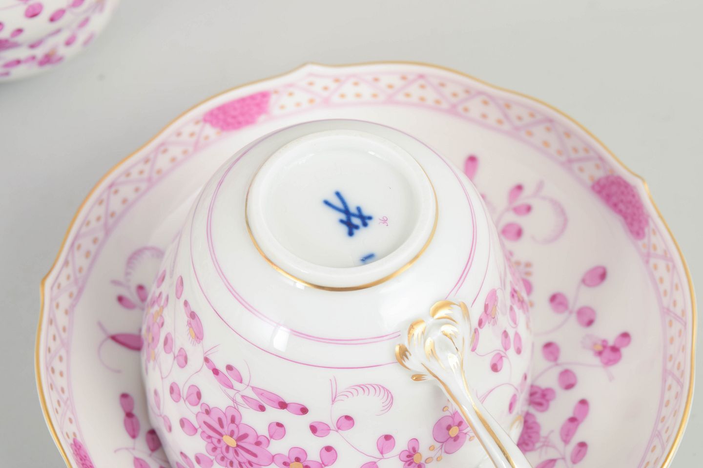 Meissen, "Pink Indian" sæt af fem store kaffekopper med underkopper.