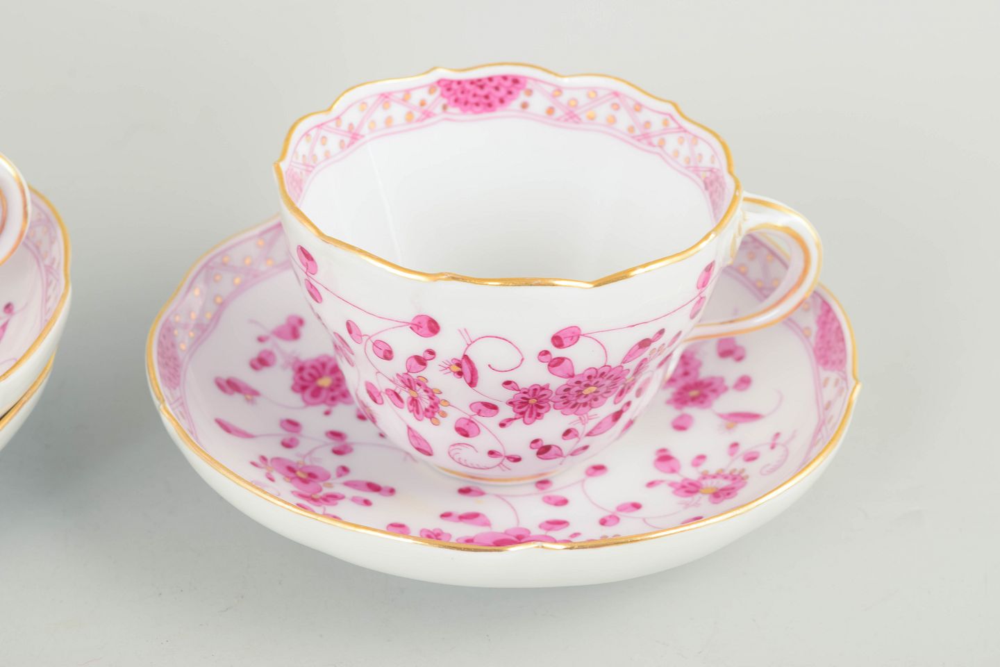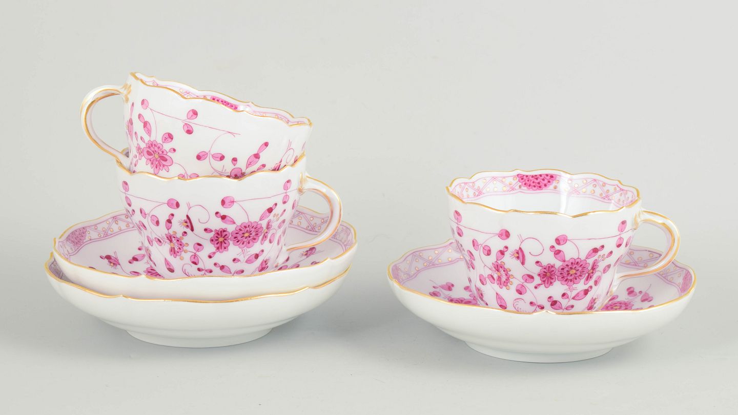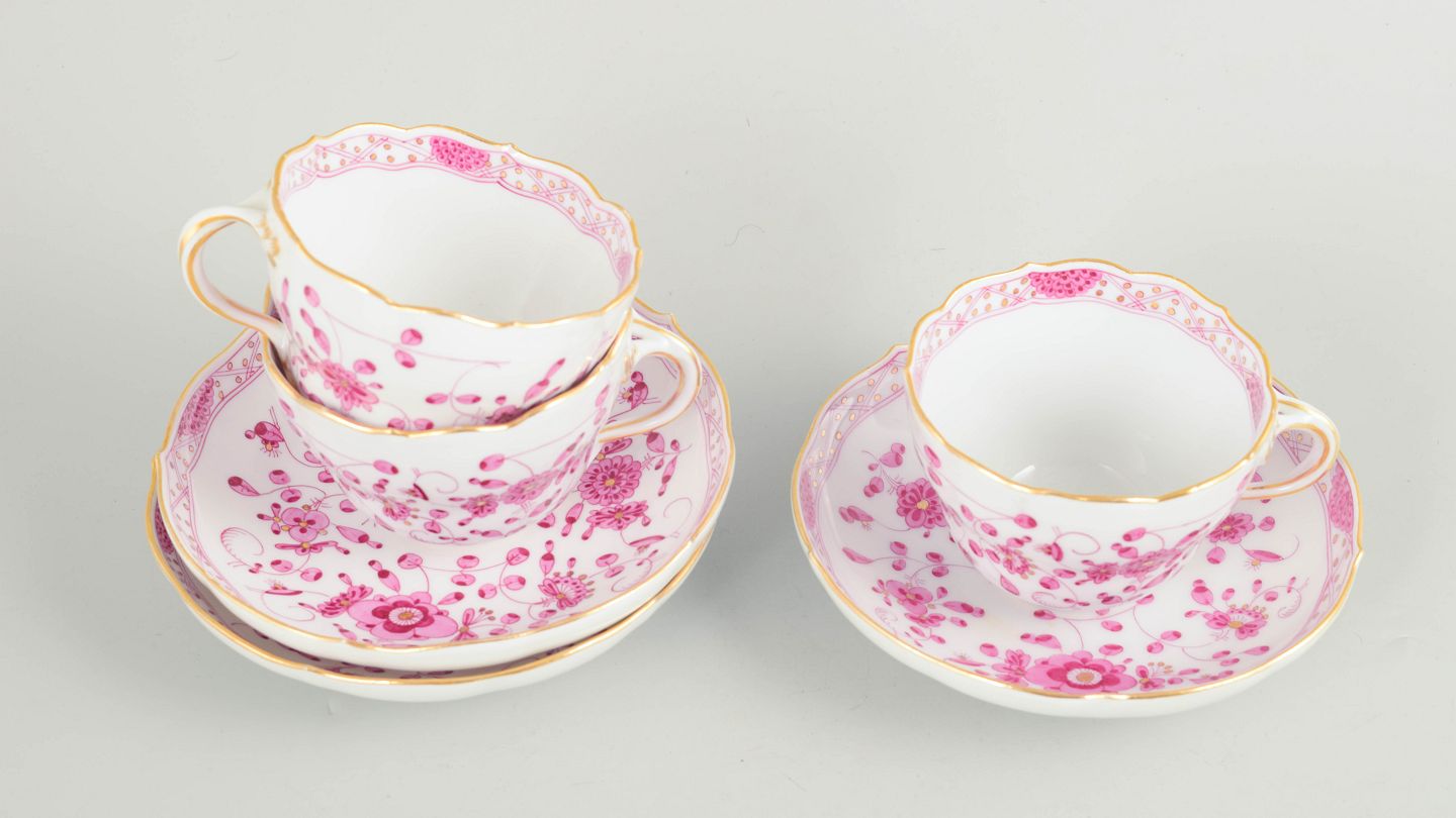 Meissen, "Pink Indian" sæt af tre store kaffekopper med underkopper.Sæt af tre store kaffekopper med tilhørende underkopper i håndmalet porcelæn med blomsterdekoration i rosa nuancer og forgyldte detaljer.