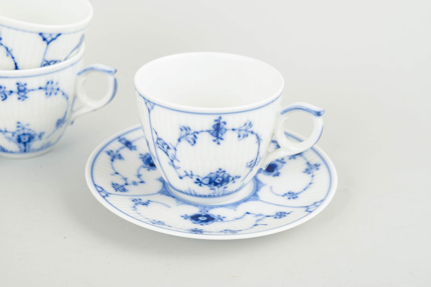 Royal Copenhagen Musselmalet Riflet, sæt af fire mokkakopper med underkopper.Sæt af fire mokkakopper med tilhørende underkopper i håndmalet porcelæn fra Musselmalet Riflet med klassisk underglasurdekoration i koboltblå.