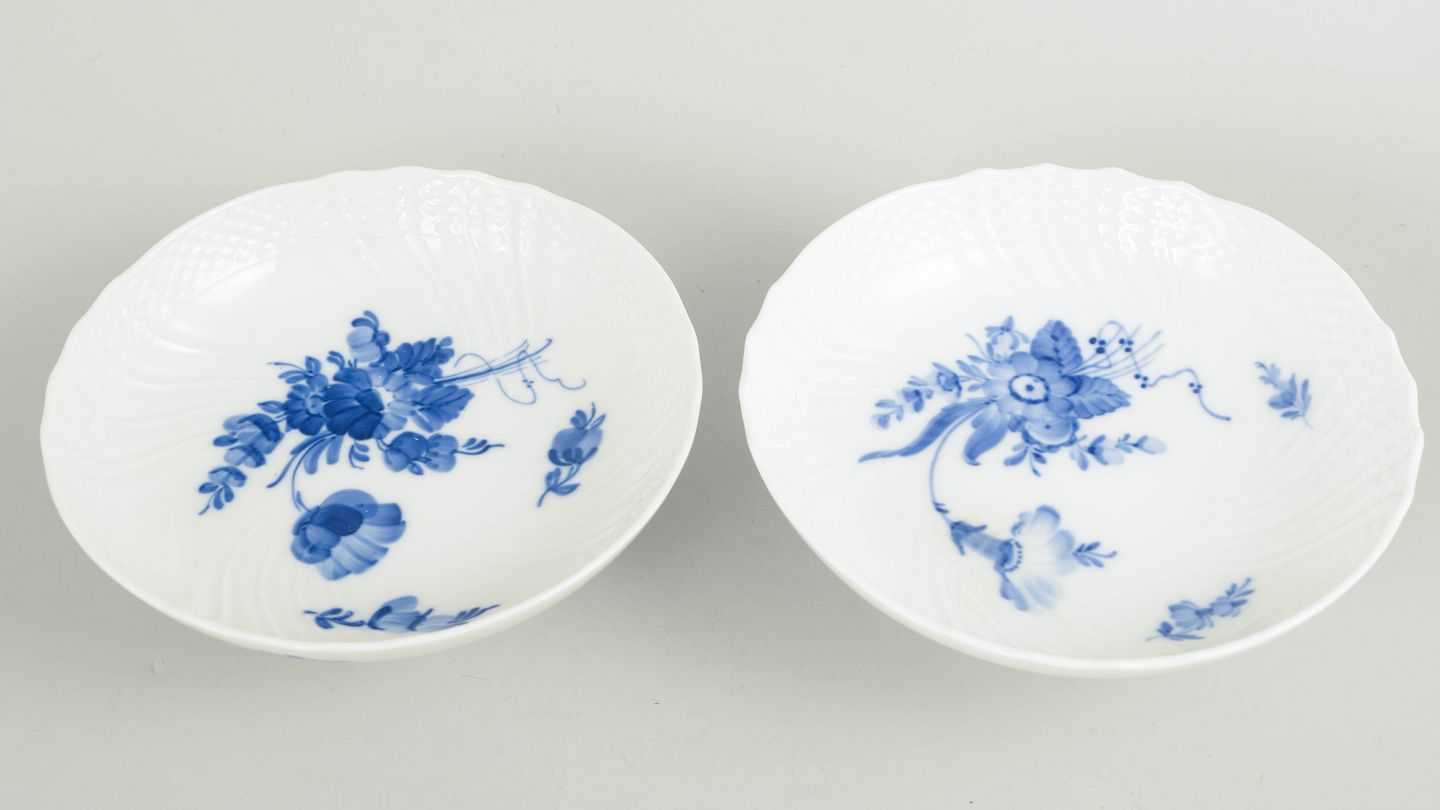 Royal Copenhagen Blå Blomst Svejfet, sæt af to små opsatsskåle.Sæt af to små opsatsskåle i håndmalet porcelæn fra Blå Blomst Svejfet med klassisk underglasurdekoration i koboltblå med naturalistisk blomstermotiv og svejfet form. Model 10/1532. Første sortering. Fremstillet i 1961.