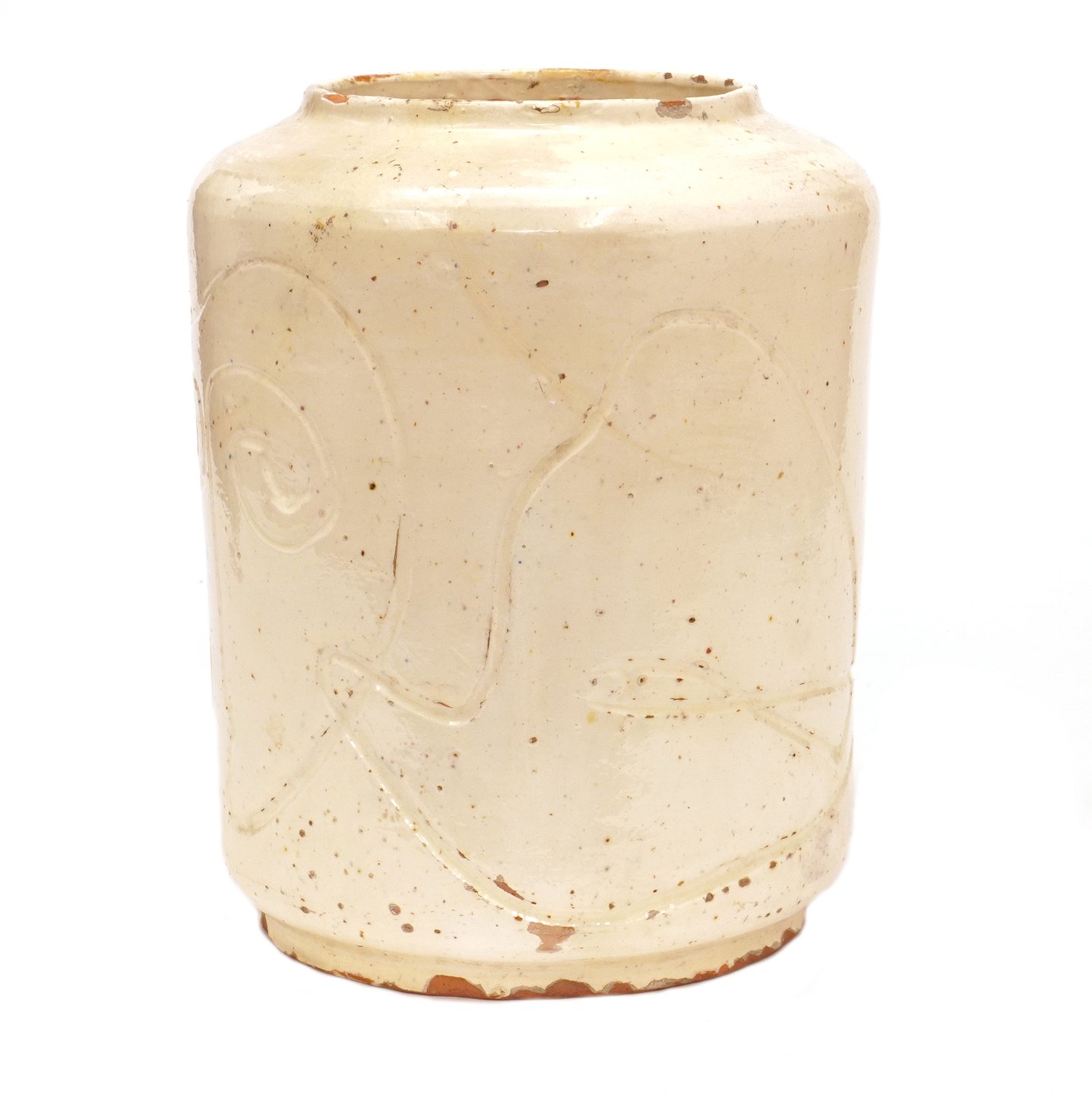 Asger Jorn keramik. Asger Jorn, 1914-73, vase i lertøj med lys glasur og dekorationerH: 26cm. D: 21cm