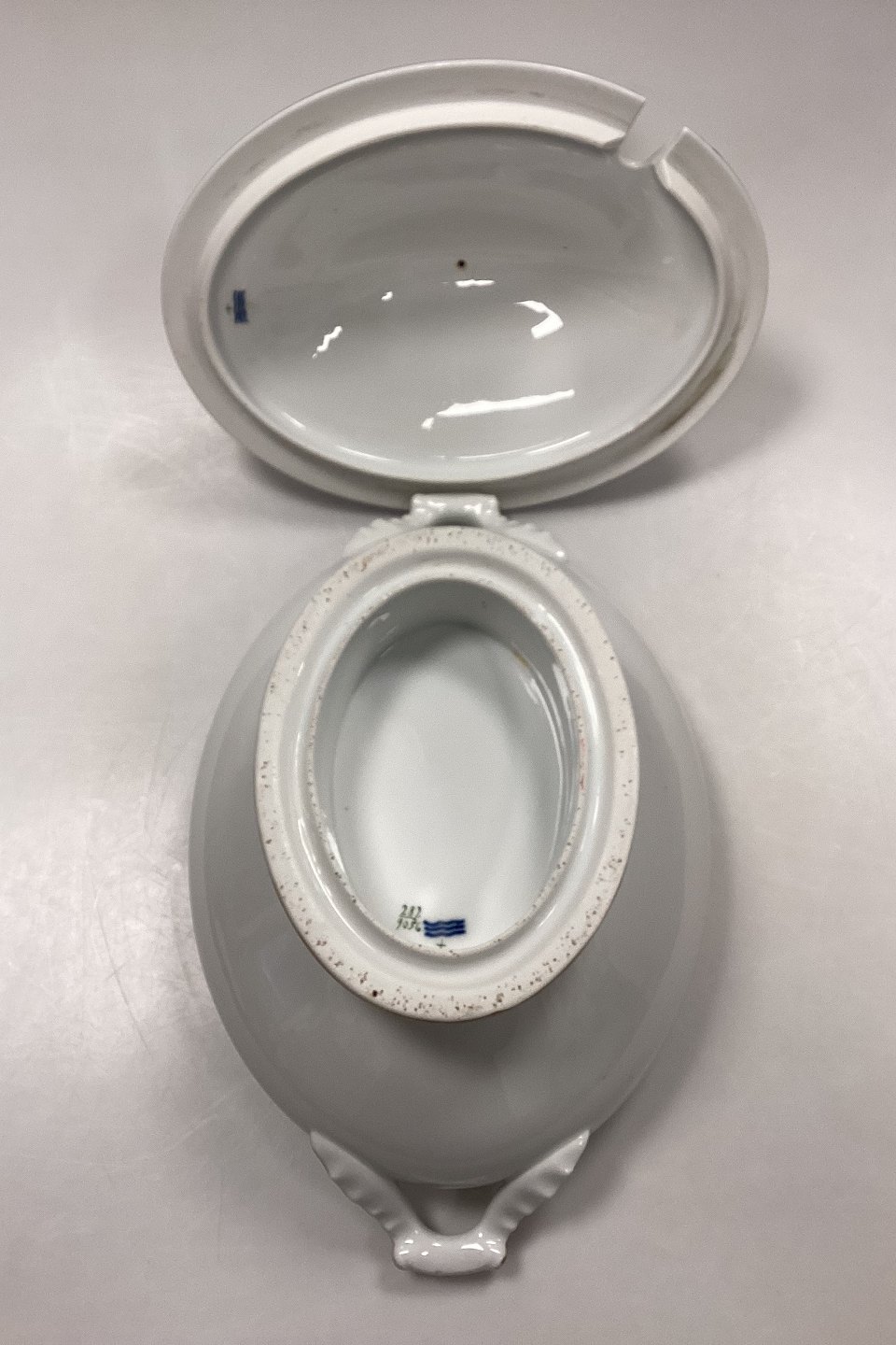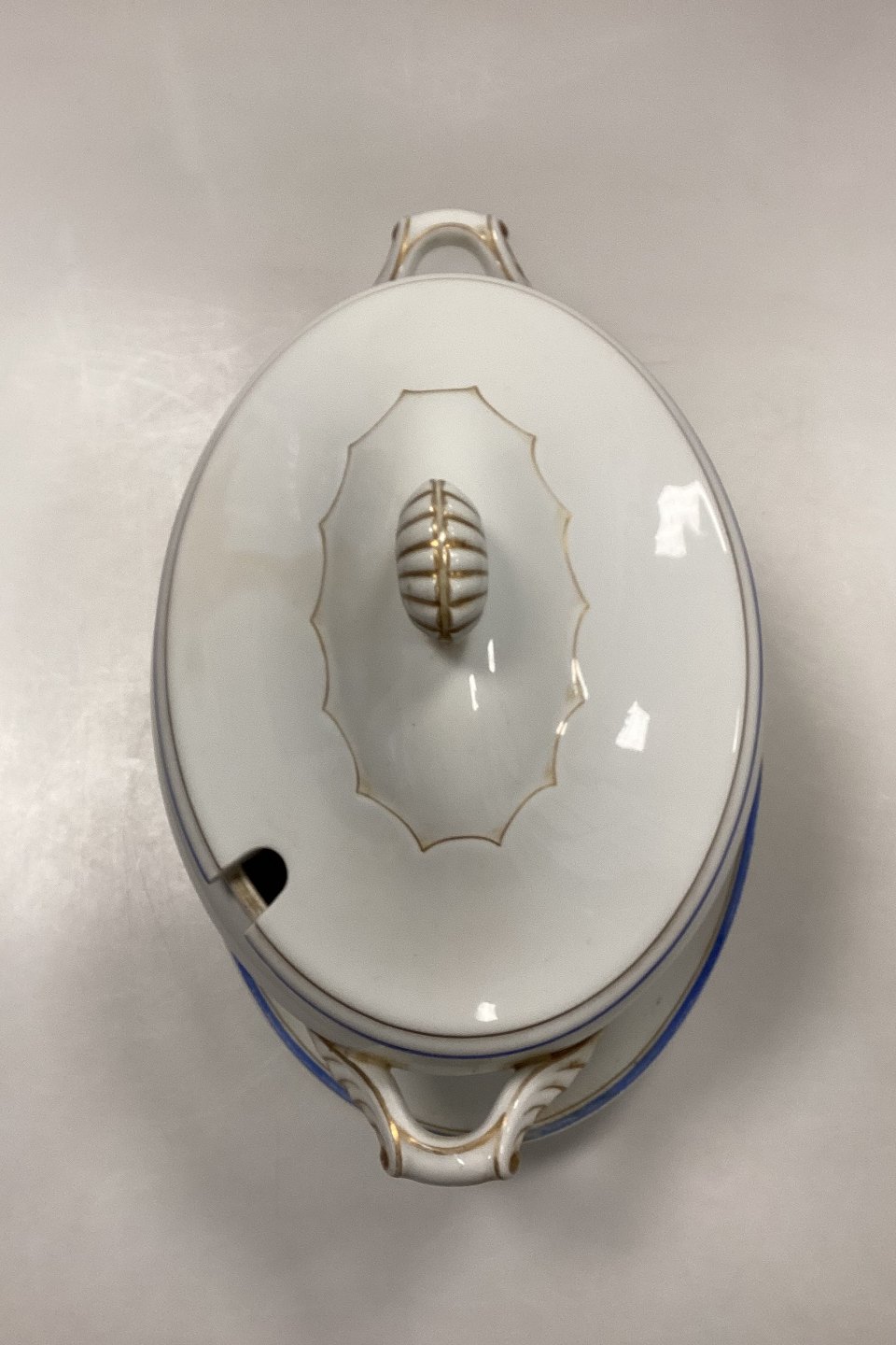 Royal Copenhagen Terrin med Underfad No. 282/9056 og 9057. Hvidt porcelæn med dekoration i guld og koboltblå. Lettere slid på guld og kanter.