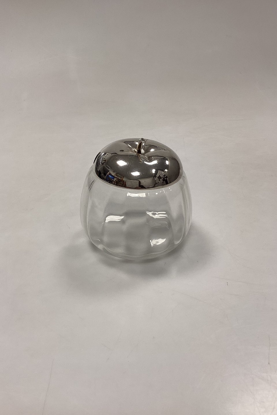 Engelsk Sølvplet/EPNS Marmeladekrukke. Glasset har optiske riller, og låget er formet som toppen af et æble.Måler 10 cm / 3,94 in. med stilk x 9,4 cm / 3,70 in. i dia.