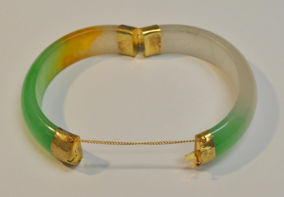 Kinesisk jade armbånd, 20. årh. Med guld lås i 8 K rødguld. Indvendig diameter: 6,2 cm. Udvendig: 8 cm.I tilhørende æske.
