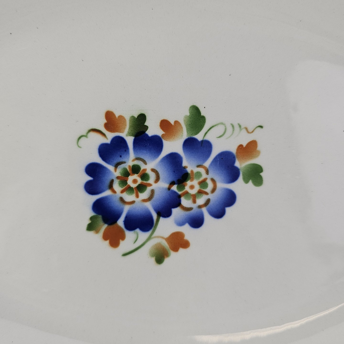 Hvidt fajancestel i stelform Sterling med motiv af blå blomster og blå prikker på kanten.