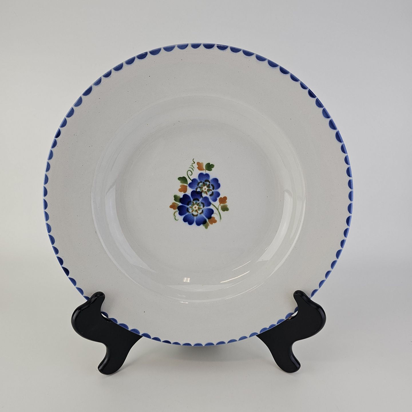 Hvidt fajancestel i stelform Sterling med motiv af blå blomster og blå prikker på kanten.