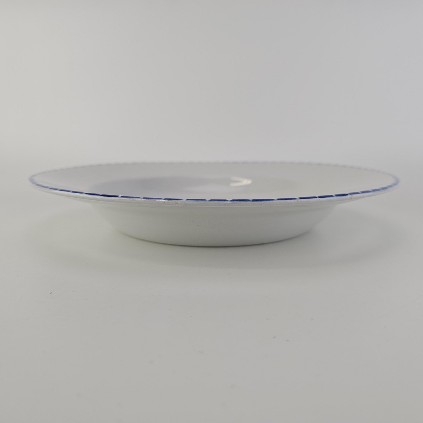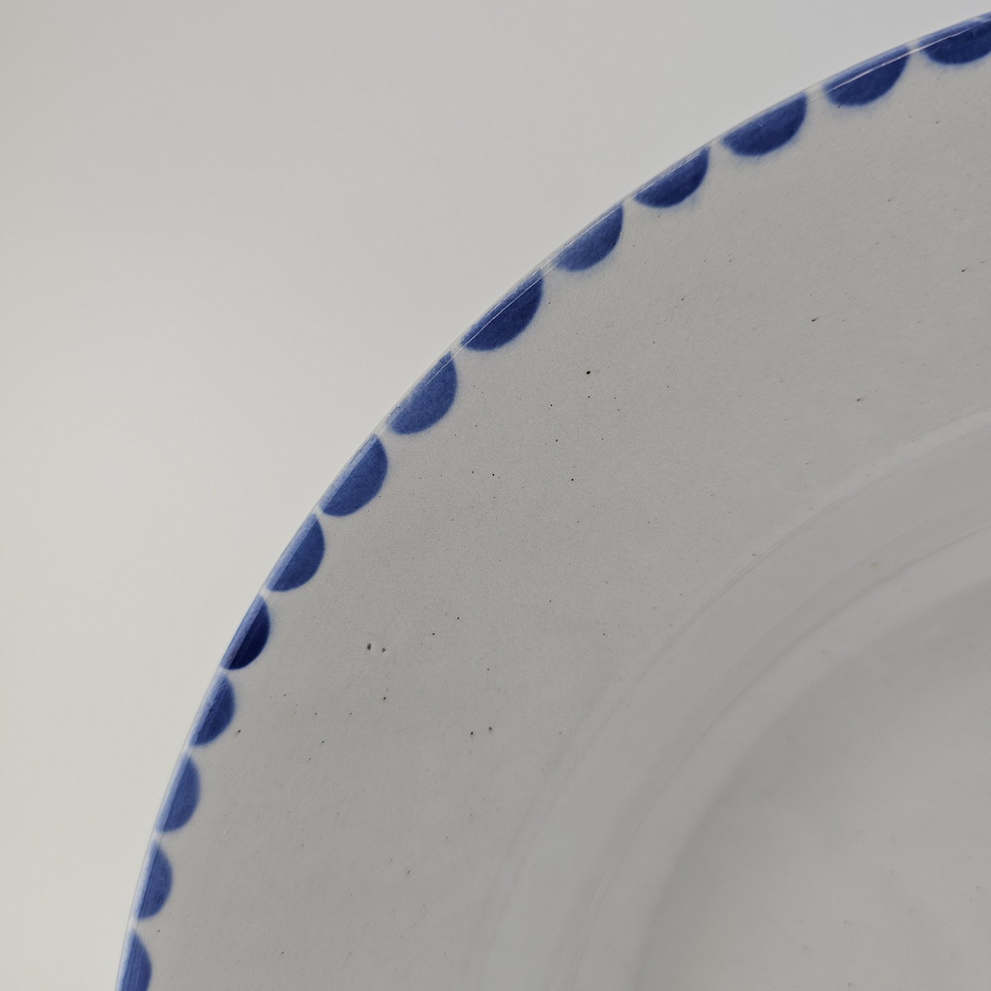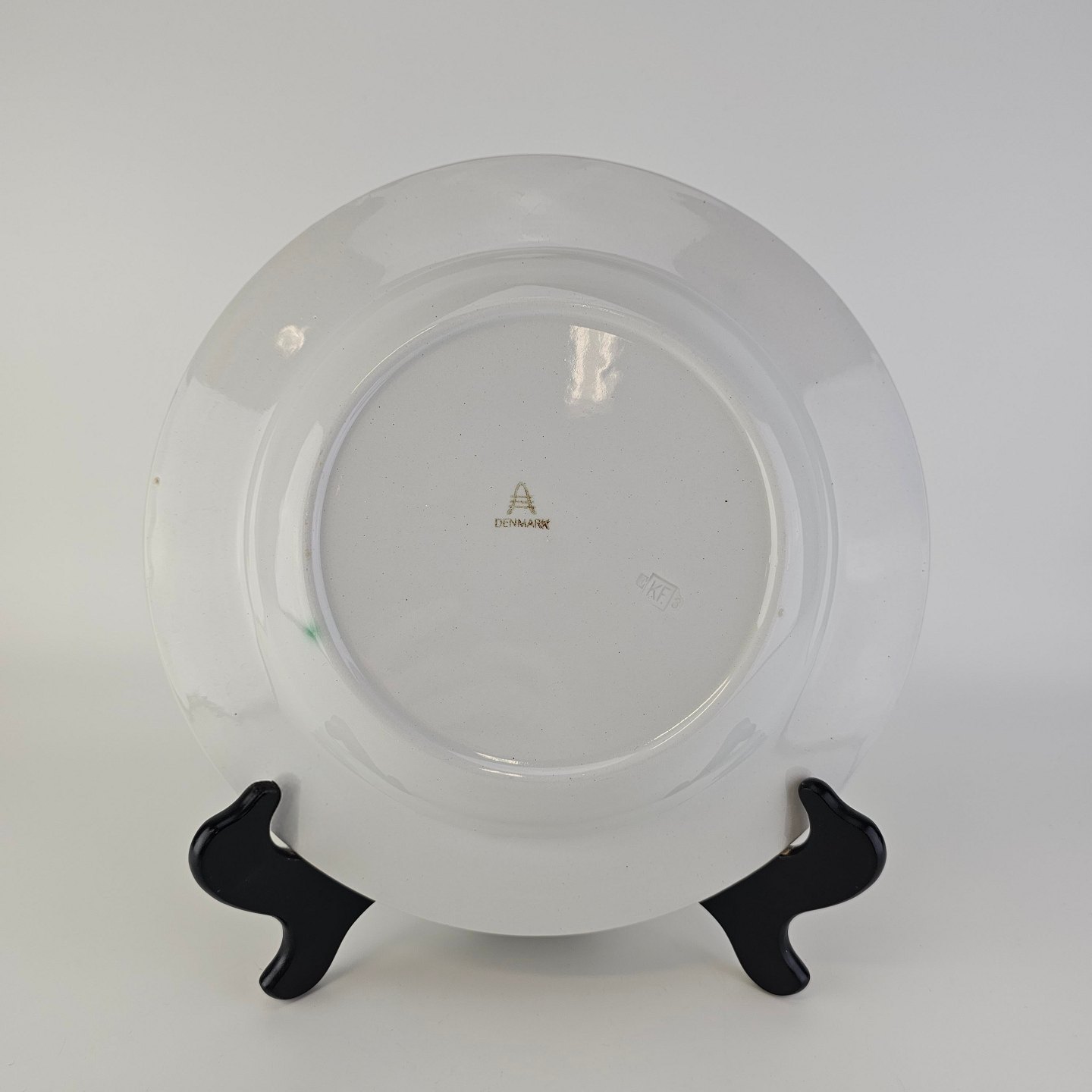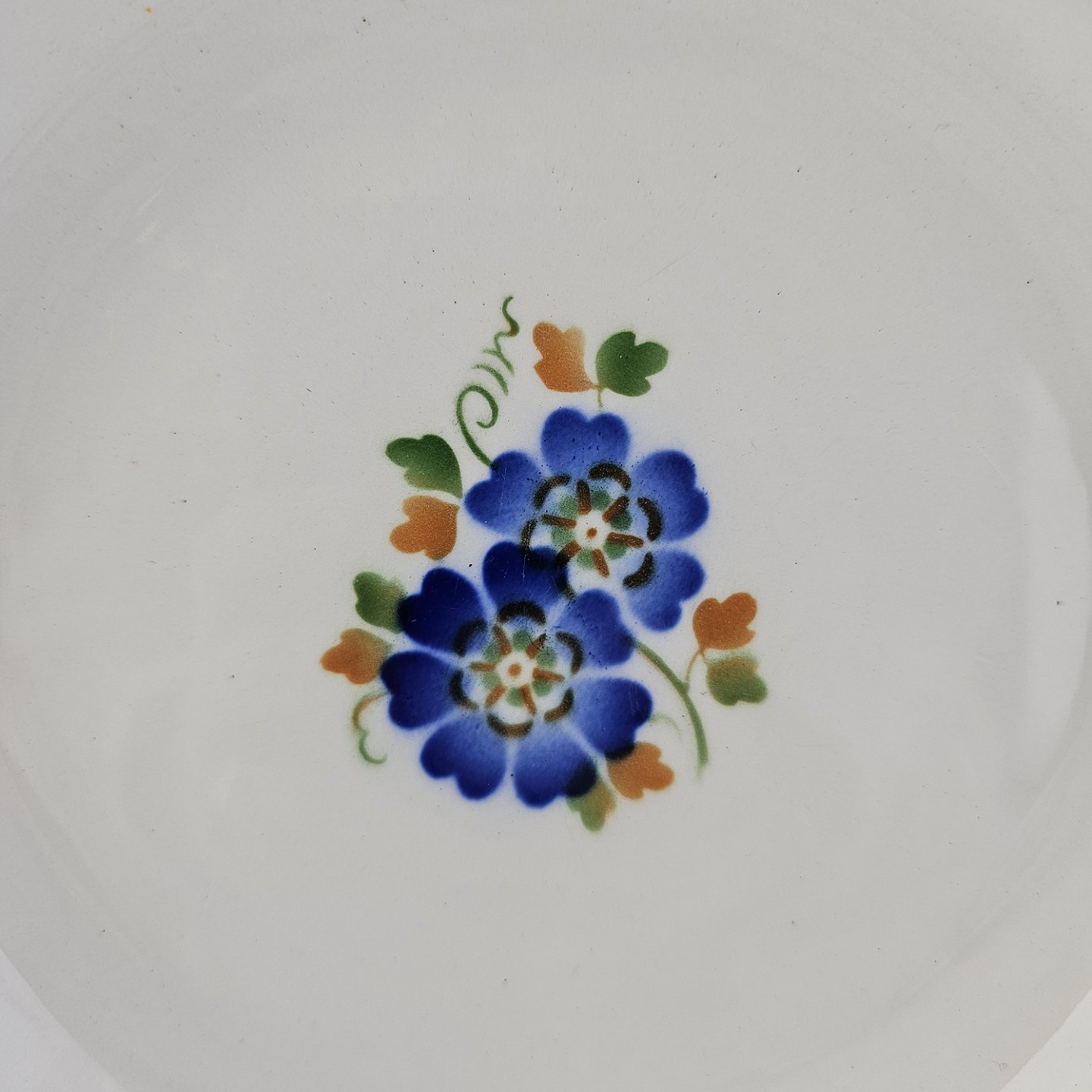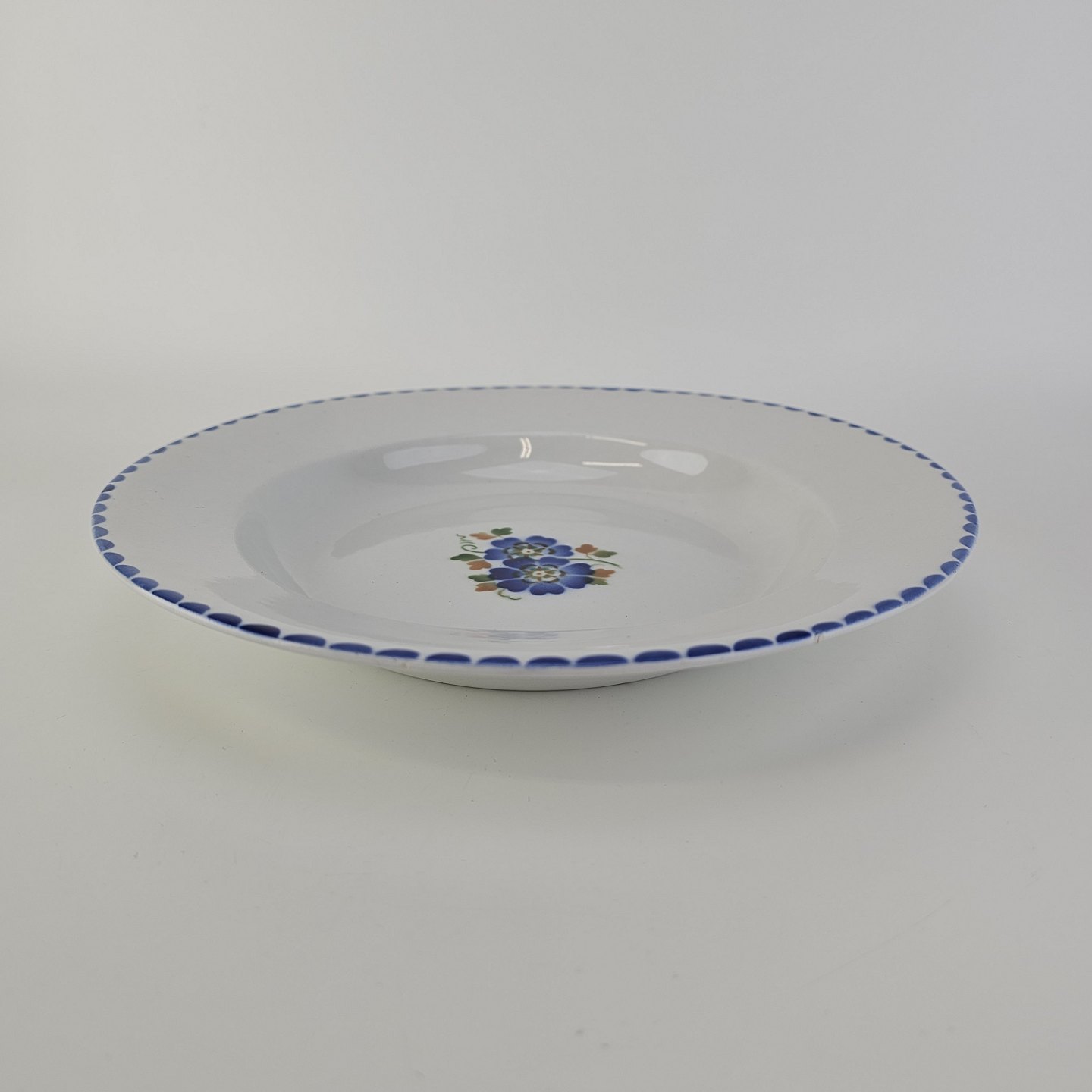 Dyb tallerken i fajance fra stellet Geranium II fremstillet i perioden 1927-1940.Formgiver Nils Thorsson