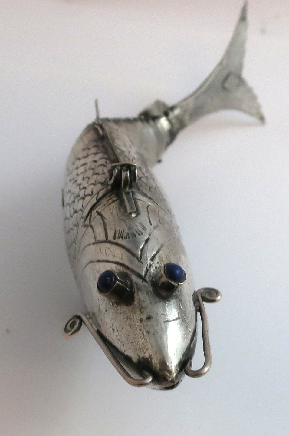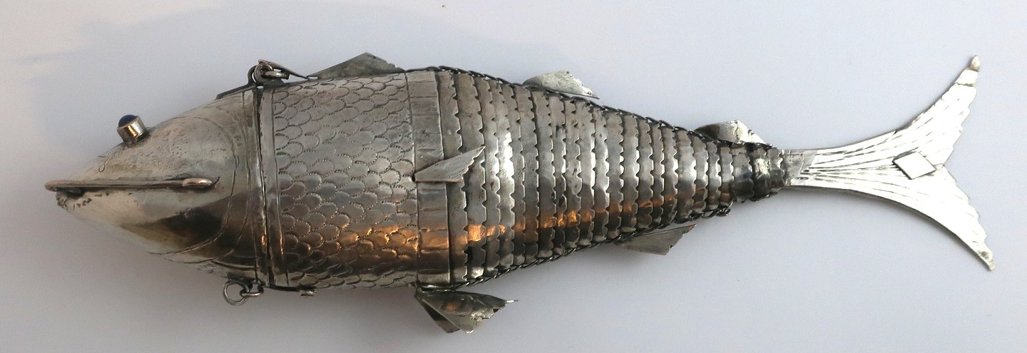 Sølv hovedvandsæg i form af stor fisk med blå sten. Længde 23,5 cm Udstiller