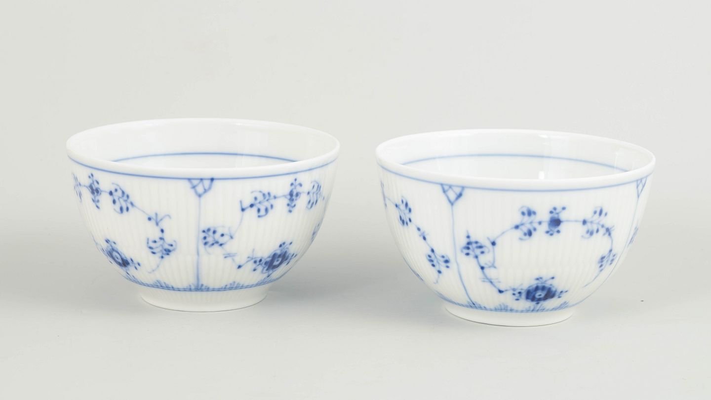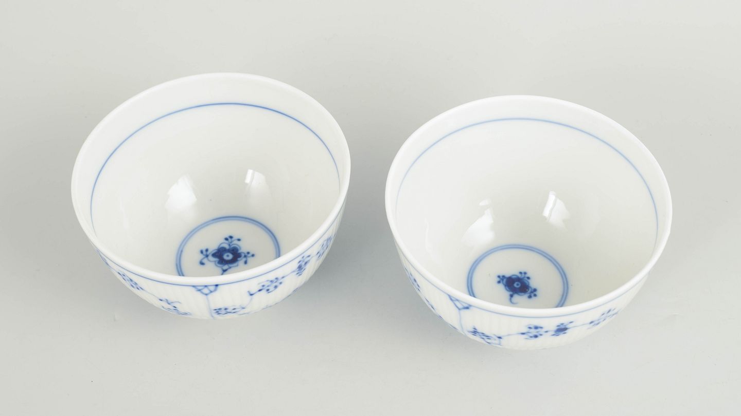 Royal Copenhagen Musselmalet Riflet sæt af to skåle.Sæt af to skåle i håndmalet porcelæn fra Musselmalet Riflet med klassisk underglasurdekoration i koboltblå og riflede felter. Model 1/209. H. 7 cm, D. 12 cm. Første sortering. Fremstillet i 1980’erne.