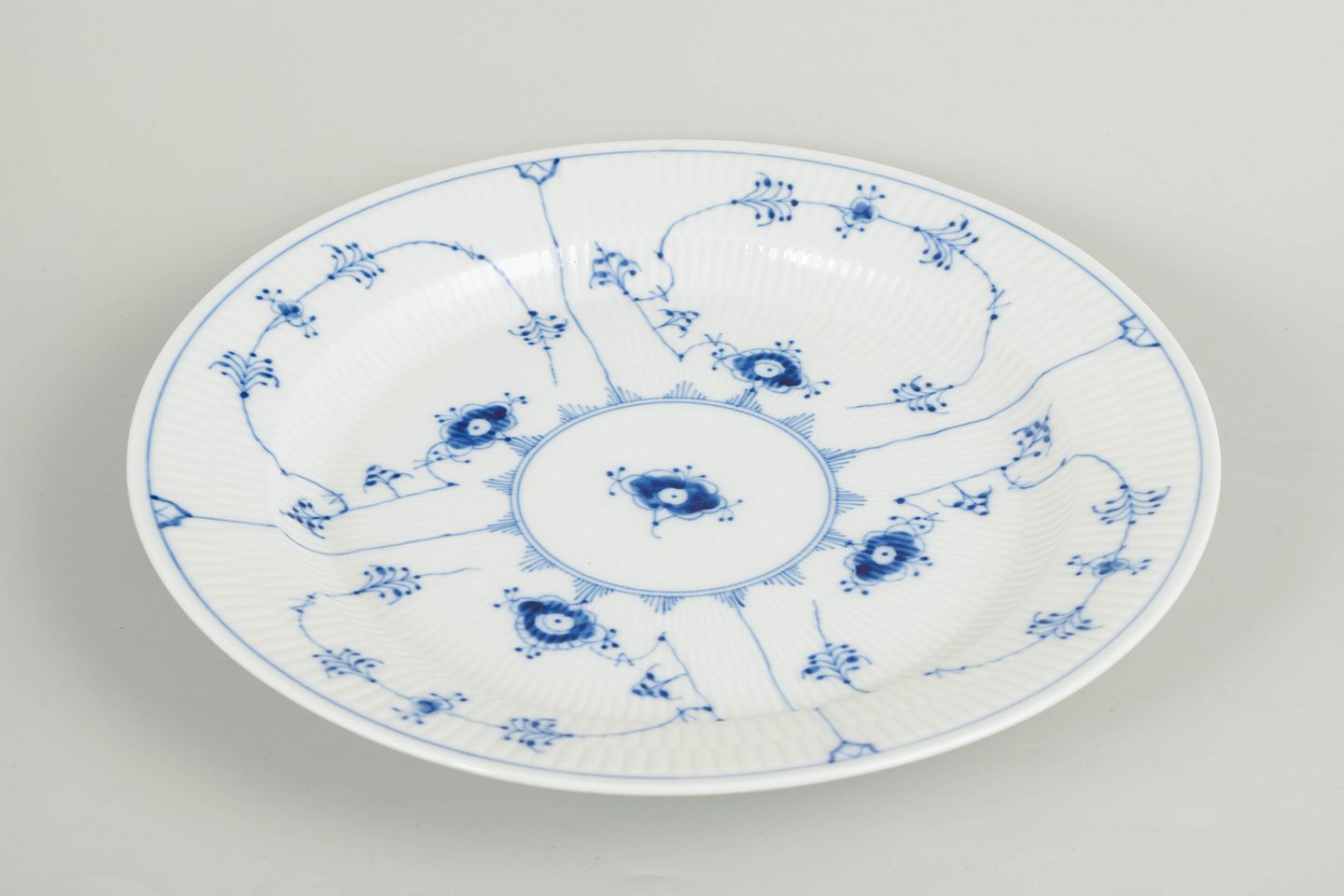 Royal Copenhagen Musselmalet Riflet stort rundt fad.Stort rundt fad i håndmalet porcelæn fra Musselmalet Riflet med klassisk underglasurdekoration i koboltblå og riflede felter. Model 1/107. H. 4 cm, D. 33 cm. Første sortering. Fremstillet i 1980’erne.