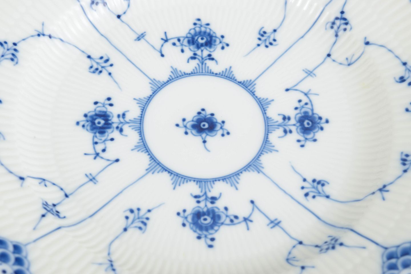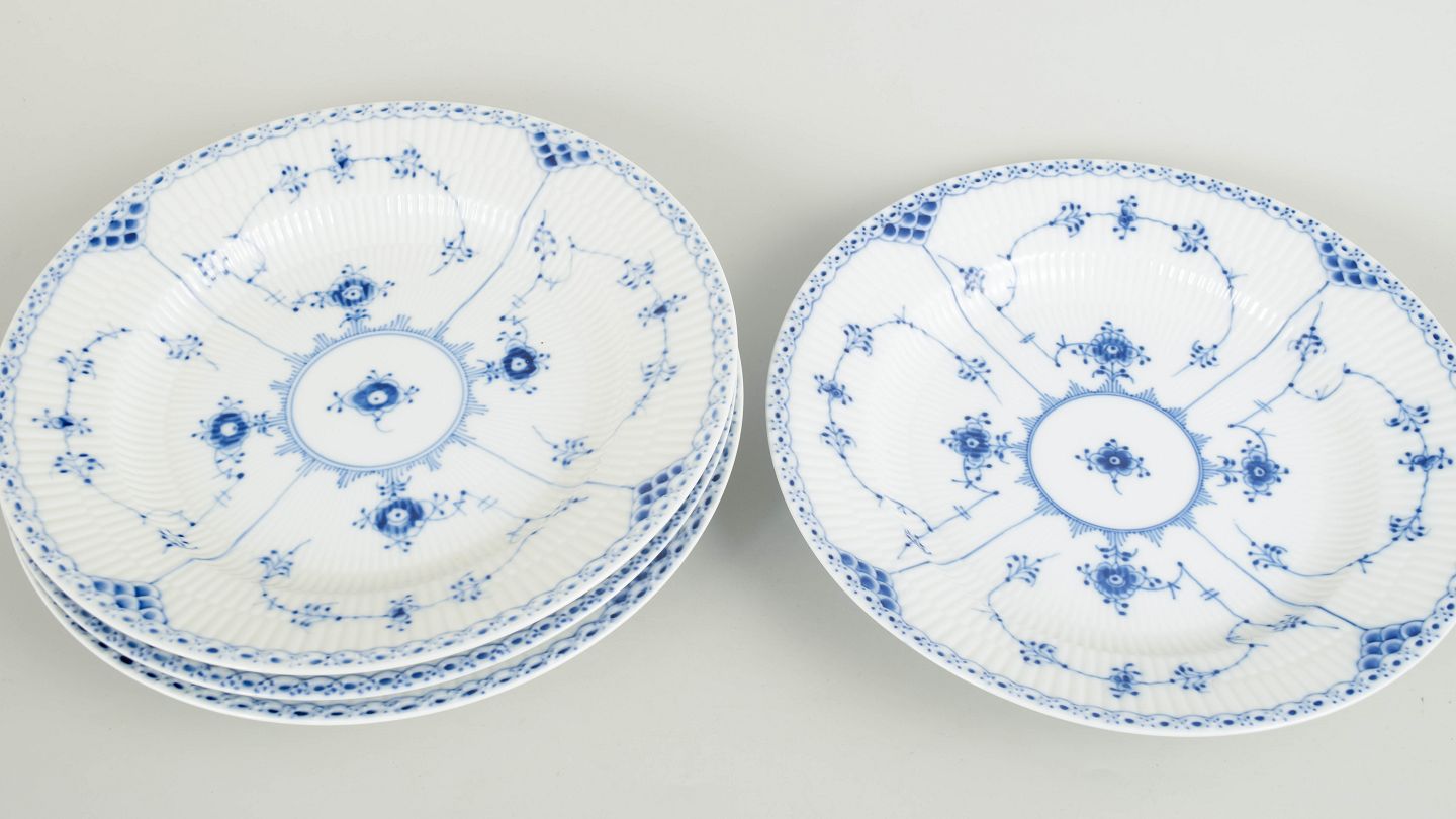 Royal Copenhagen blev grundlagt i 1775 i København under kongelig bevilling. Fabrikken er internationalt anerkendt for sit håndmalede porcelæn og sit høje kunstneriske niveau. Musselmalet Halvblonde er en videreudvikling af det klassiske Musselmalet stel, hvor riflede flader kombineres med en dekorativ blondekant og detaljeret håndmalet dekoration.