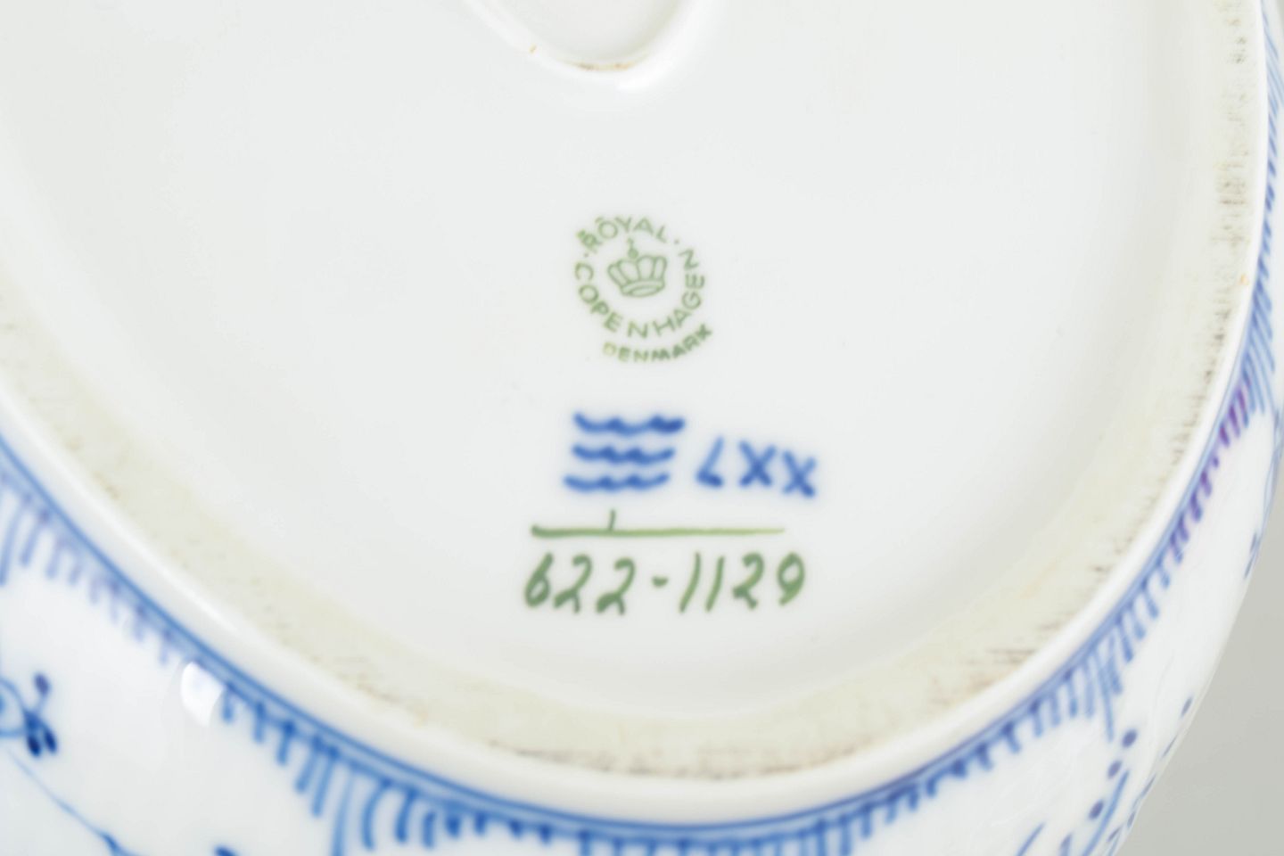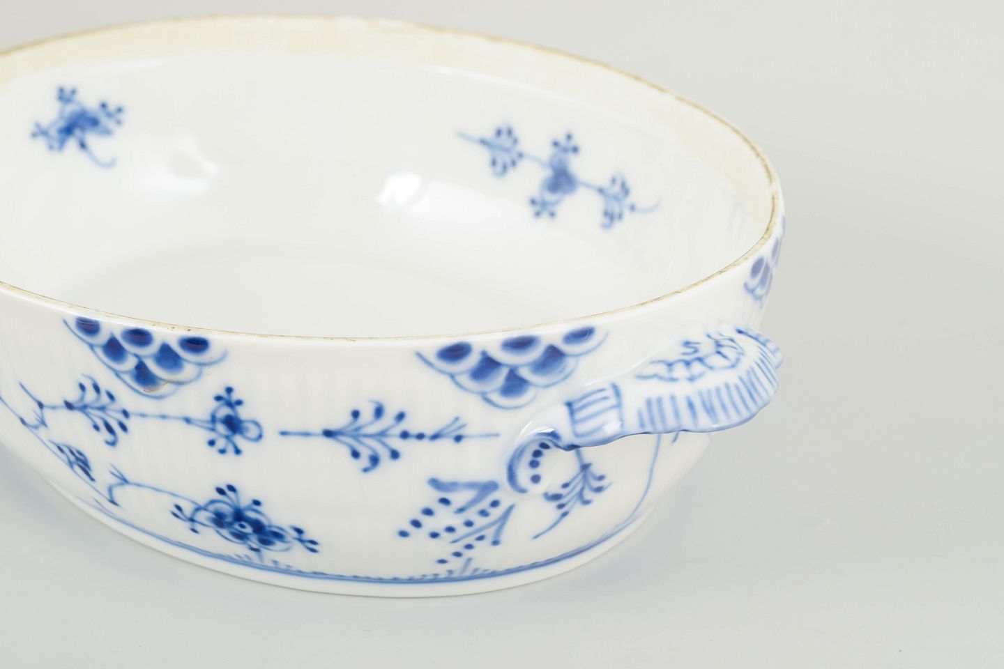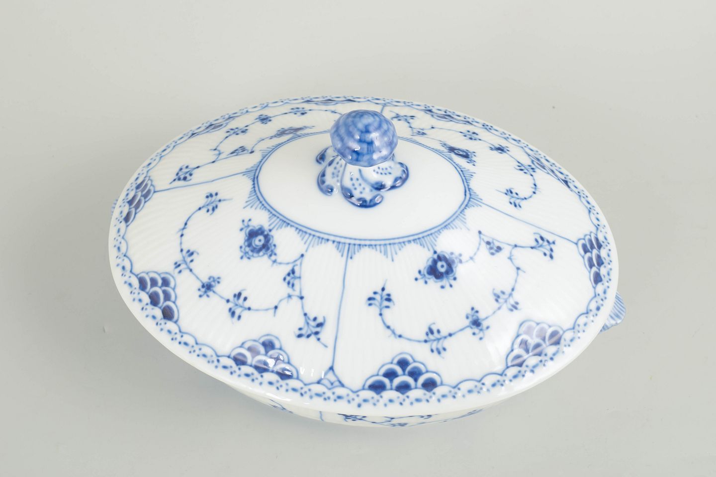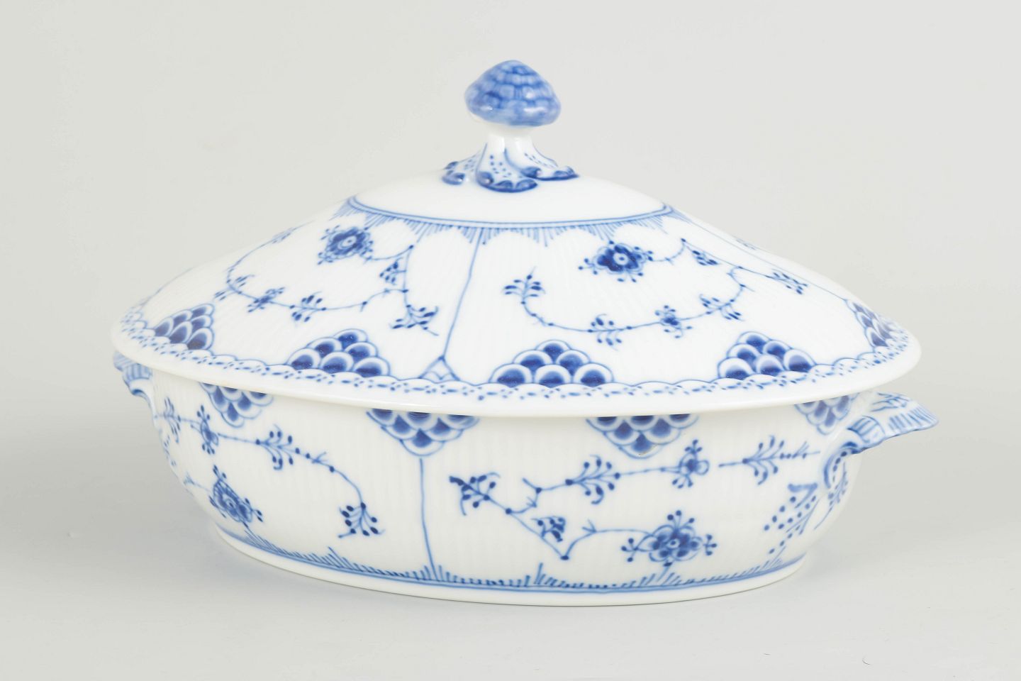 Royal Copenhagen Musselmalet Halvblonde oval terrin med låg.Oval terrin med låg i håndmalet porcelæn fra Musselmalet Halvblonde med klassisk underglasurdekoration i koboltblå og karakteristisk blondekant. Model 1/622. H. 16 cm, B. 26 cm. Første sortering. Fremstillet i 1980’erne.