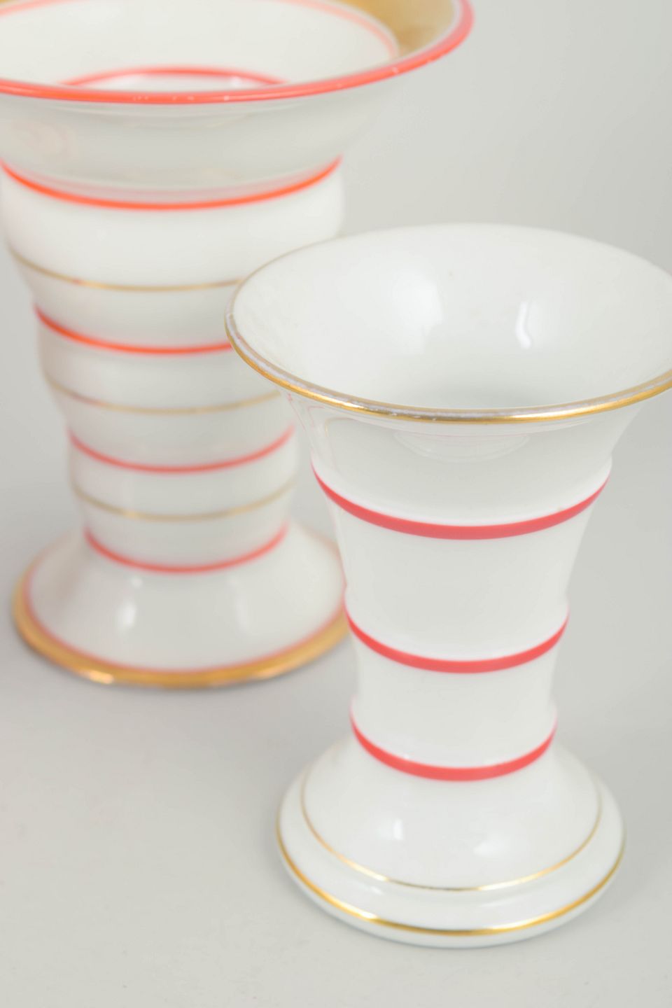 Sæt af tre tyske art deco vaser.Tre små vaser i porcelæn med klassiske art deco former og dekoration i hvide nuancer med koralrøde stafferinger og guldkant. Vaserne fremstår med elegante proportioner og karakteristisk stil fra tysk porcelænsproduktion i mellemkrigstiden.