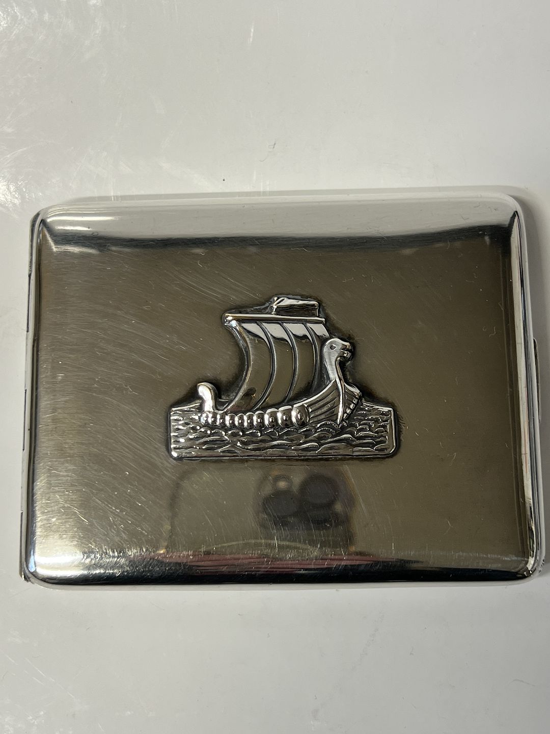 Cigaret etui / Kort etui Sølvplet med skibsmotivStemplet A.J.PLF