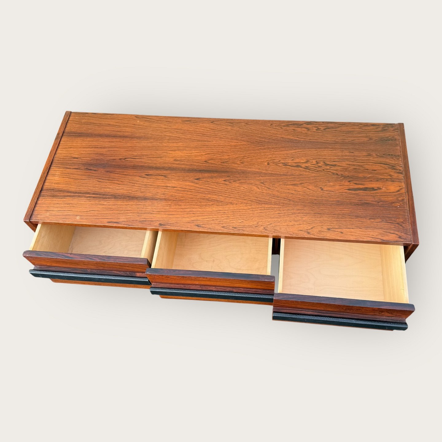 Lav skænk i palisander finer, tre skuffer med læderbetrukne håndtag, Udgået og mærket fra Illums Bolighus, Mål: HxBxD 46x116x45cm, har været stort entresæt i kombination med Palisanderspejlet varnr. 632831 *Fremstår i pæn brugt stand med få brugsspor*Lager: 1