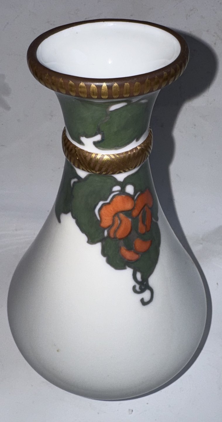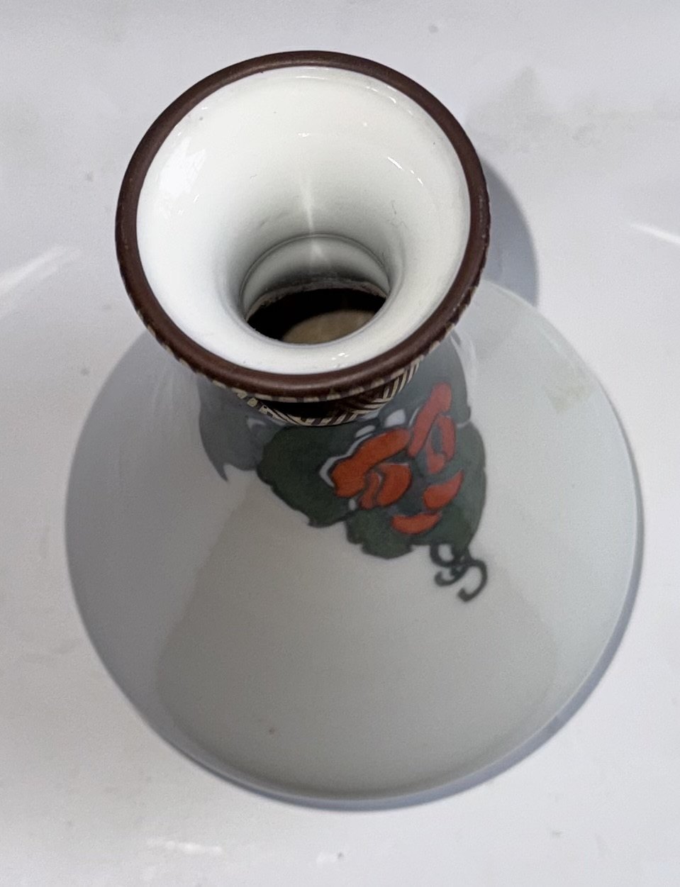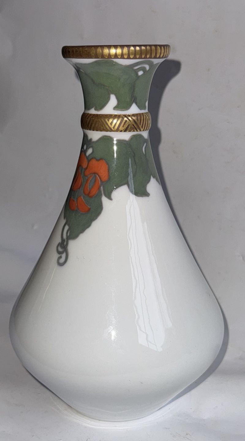 Art Nouveau vase i porcelæn fra Royal Copenhagen med smuk og farverig dekoration med bl.a. guld, oberst på vasen. Fremstår i perfekt stand. 1. Sortering. Fabriksmærket på bunden. Fremstillet mellem 1900-1923. Mål: H. 20,5 cmv/ Jesper Reutemann