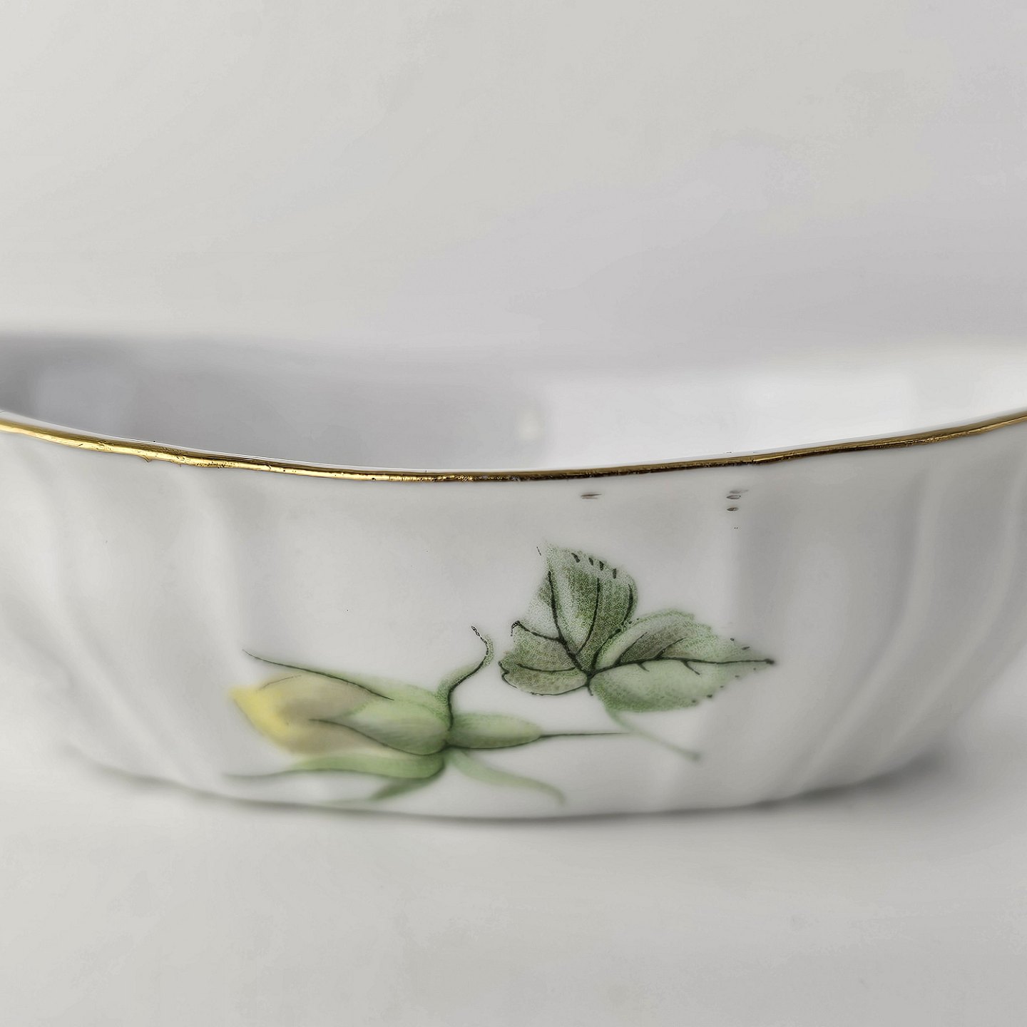 Service i glat hvidt porcelæn med lige knækkede kanter dekoreret med gule blomster og gylden kant