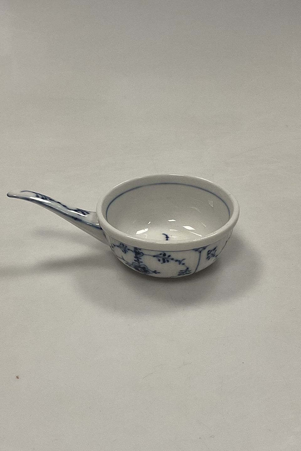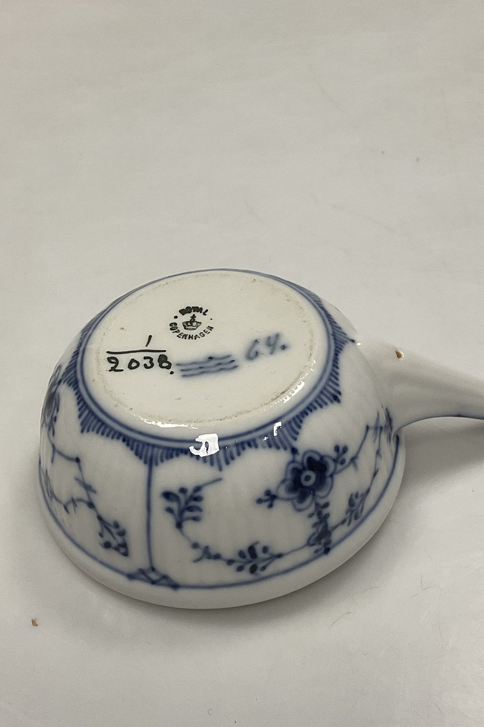 Royal Copenhagen Musselmalet Riflet skål med håndtag No. 2038Måler 13,2cm med håndtag og 8cm dia / 5.20 inch x 3.15 inch