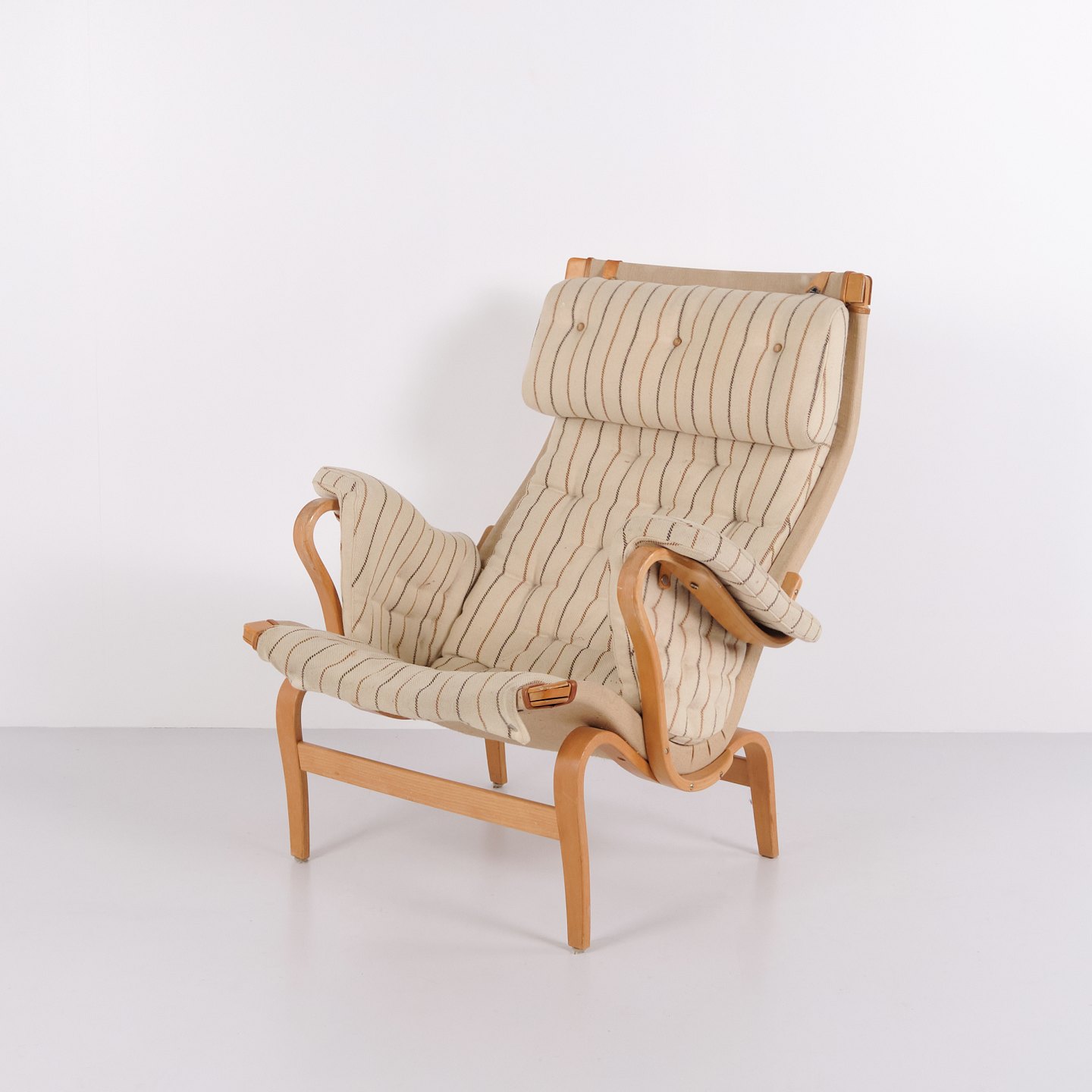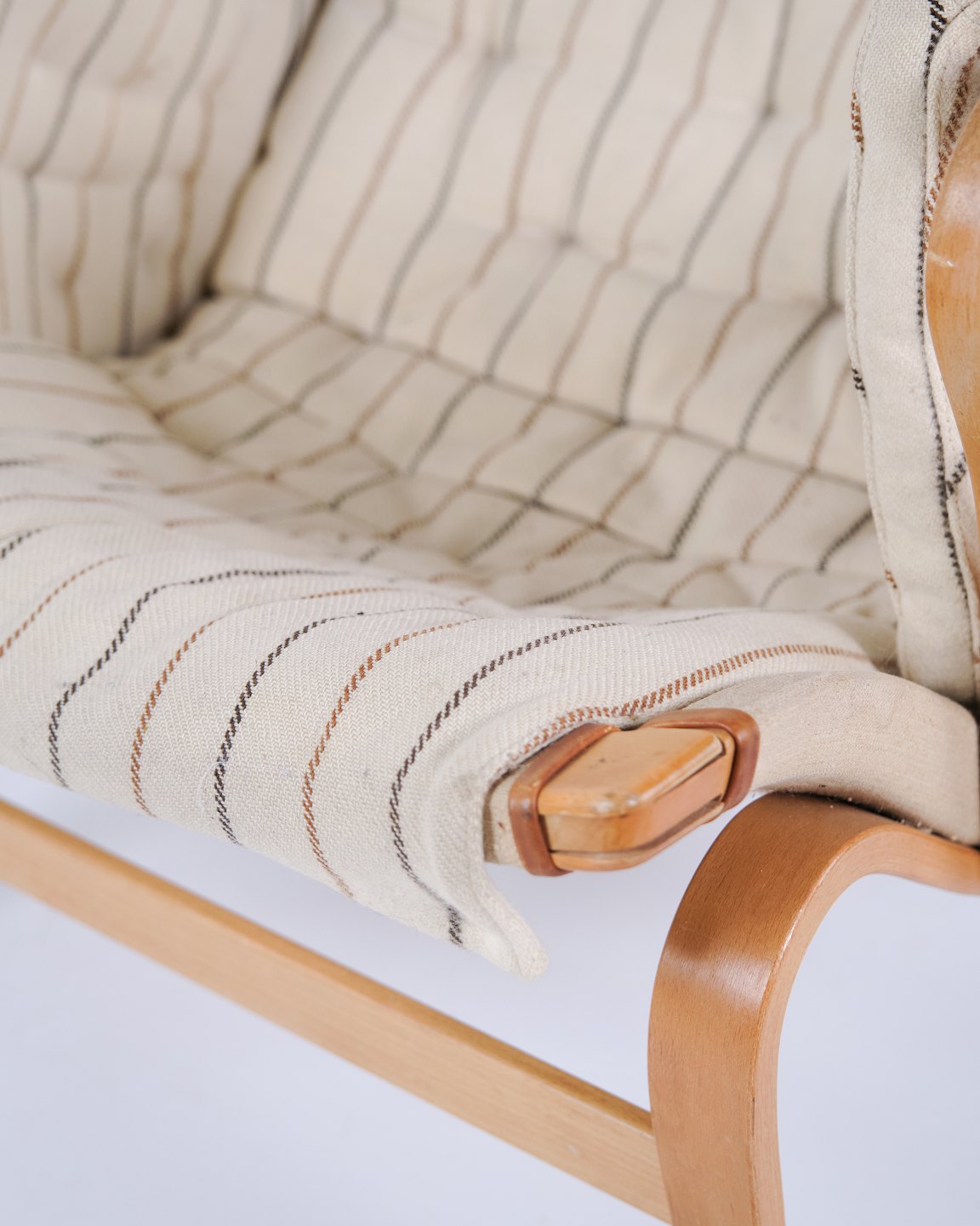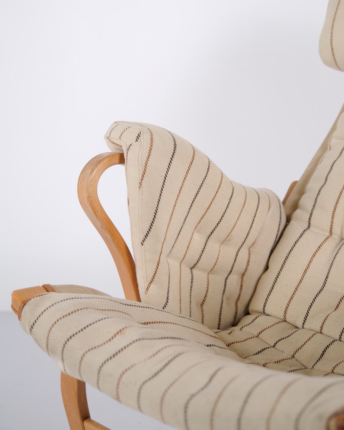 Fauteuil Bruno Mathsson Pernilla modèle 69 de DUX en tissu rayé et bois de hêtre. Design scandinave classique des années 1960.— Origine : Suède