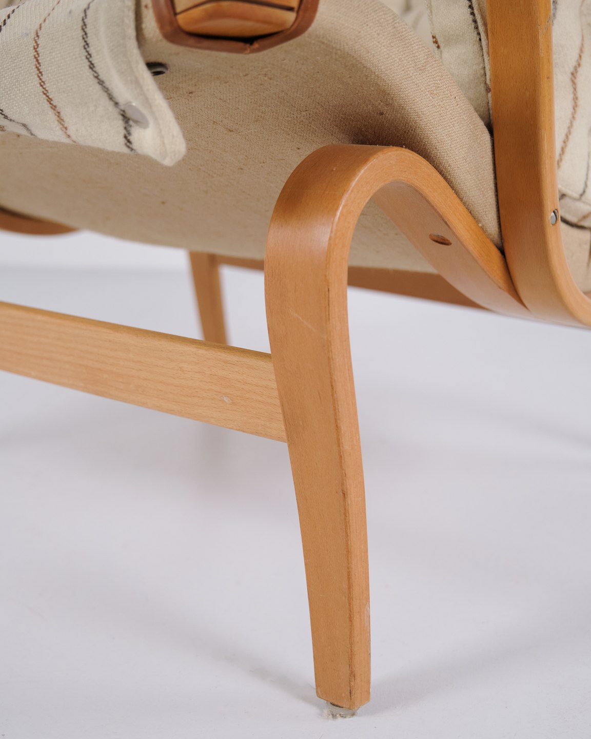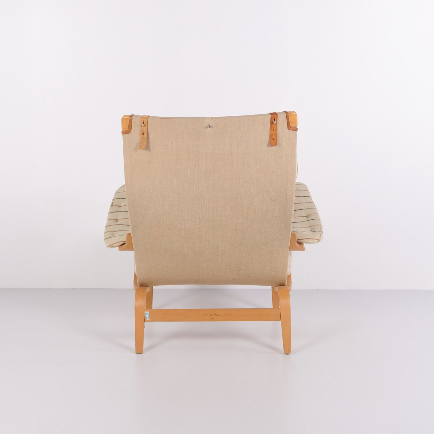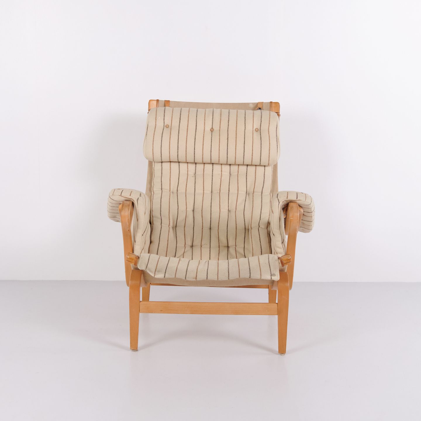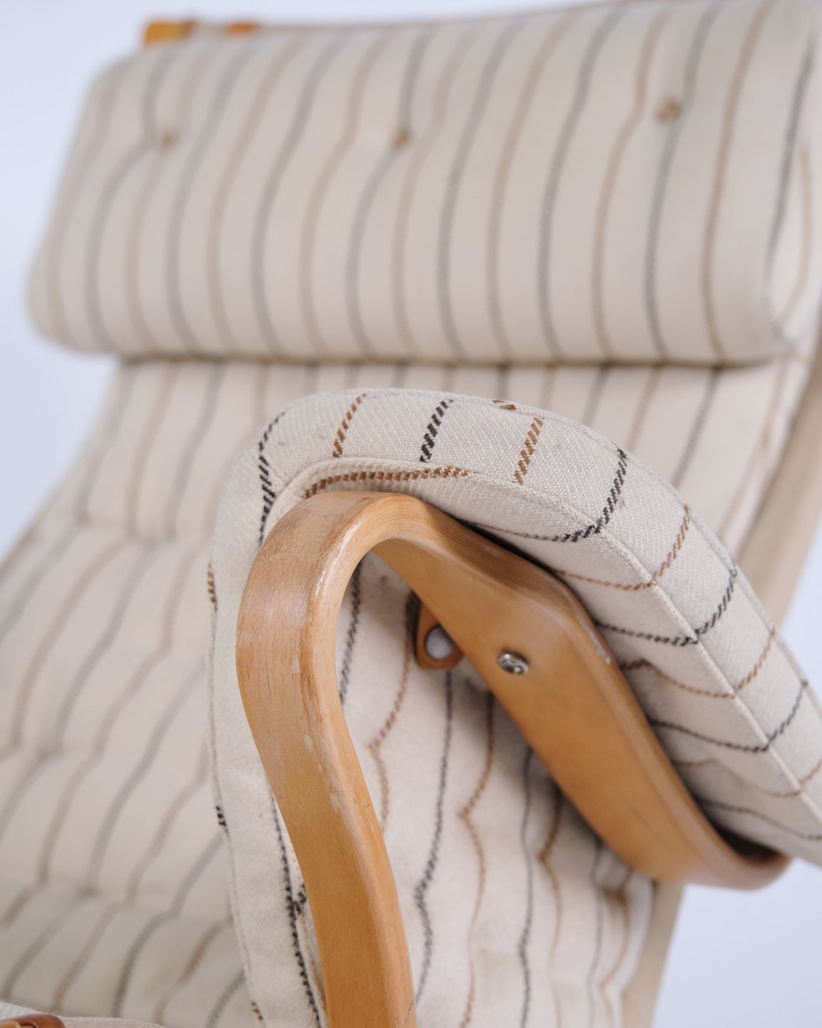 Fauteuil Bruno Mathsson Pernilla modèle 69 de DUX en tissu rayé et bois de hêtre. Design scandinave classique des années 1960.— Origine : Suède