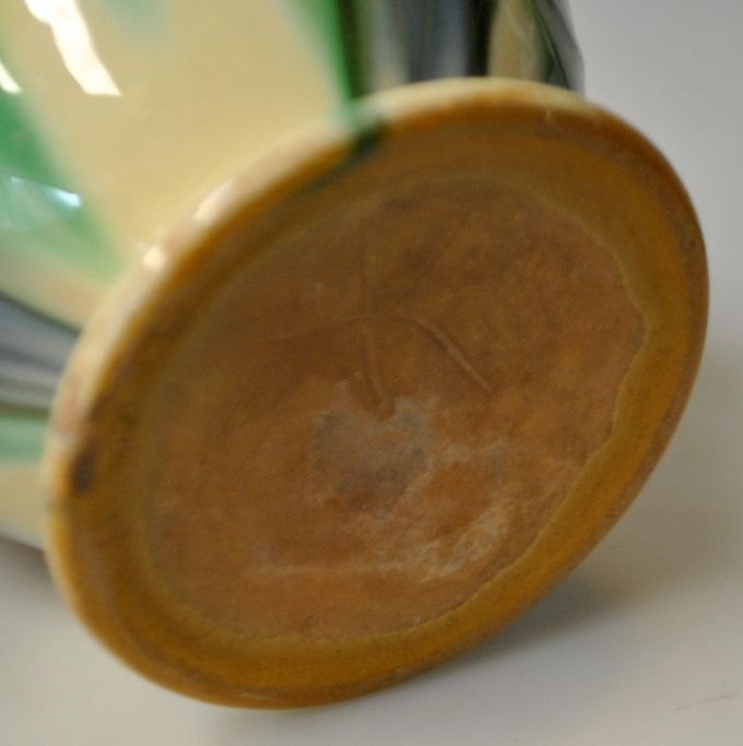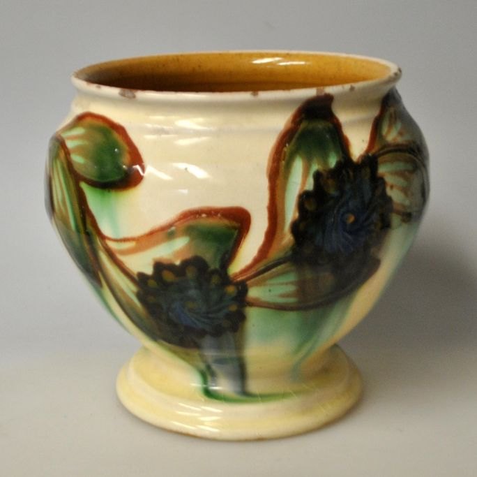 H. A. Kähler urtepotte, 20. årh. Næstved, Danmark. Glaseret. Med grønne, brune, blå og sorte glasurer. Stemplet. 13 cm.NB: Med små kanthak!