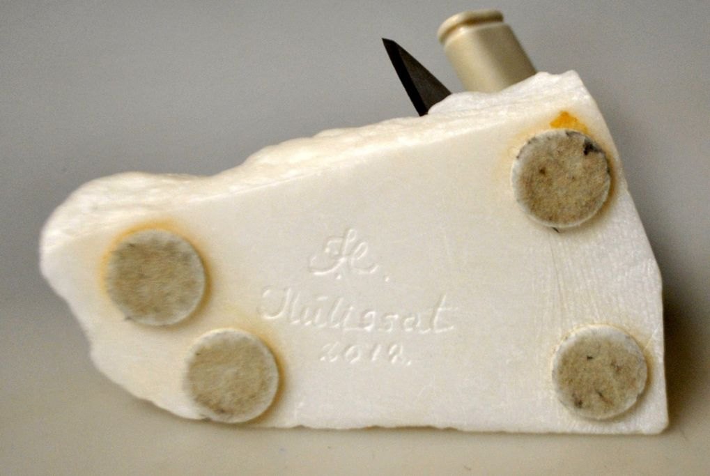 Grønlandsk figur, 2012. Figur og ulu i rensdyr knogle. På hvid fedtsten base. Signeret: Ilulissat. L.: 14 cm. B.: 8 cm. H. 10 cm.Emne nummer: 28967
