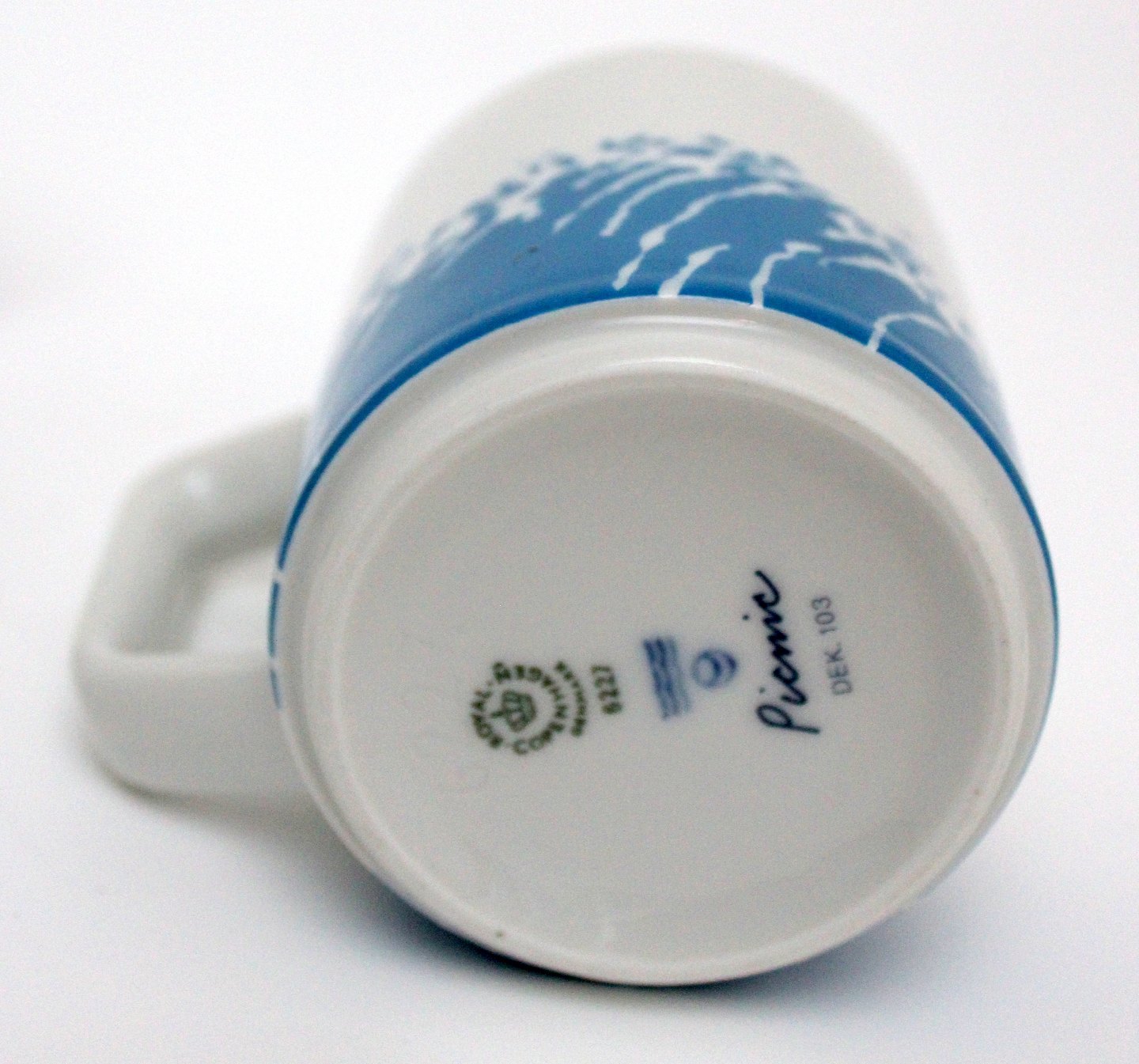 Royal Copenhagen, Picnic, Kaffekrus med blå dekoration. Designet af Grethe Meyer og Ole Kortzau. Nr. 6227. Dekoration 103. Højde 9,5 cm. Diameter 7,5 cm. Flot stand. I. sortering. Pris: 300 kr. stk. Lager: 2 Udstiller