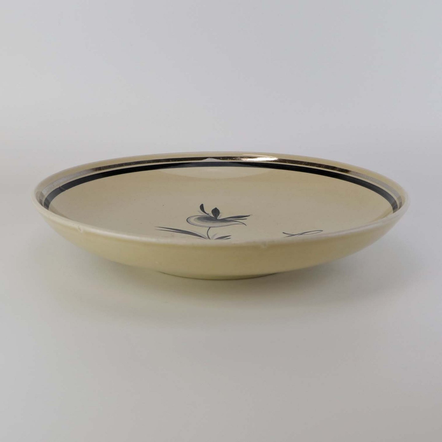 Råhvidt fajancestel i stelform E med dekoration af naturmotiver i sølv og sort farve.