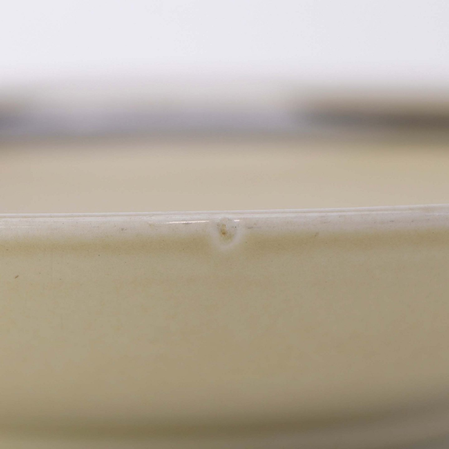 Fremstår med krakkeleringer i glasuren, lettere ridser, brugsspor på dekorationen samt ujævnheder i glasuren.