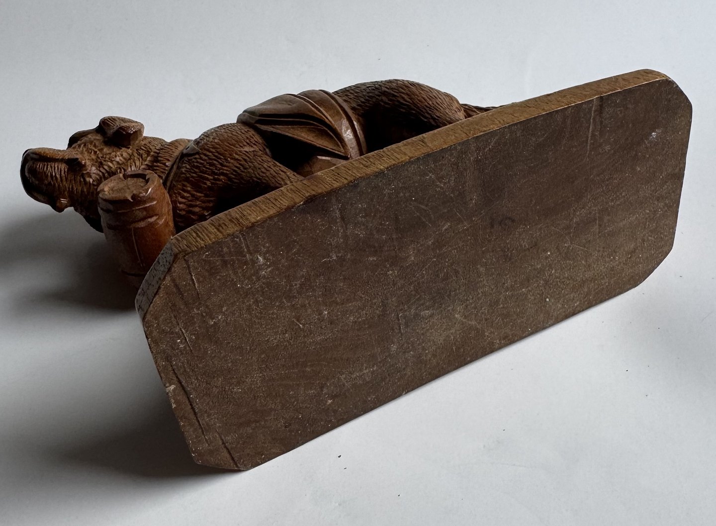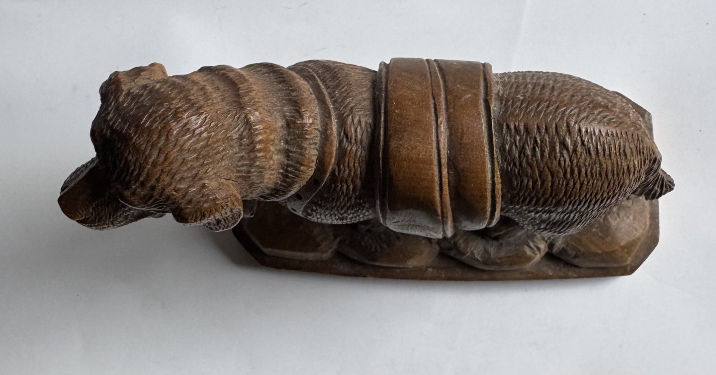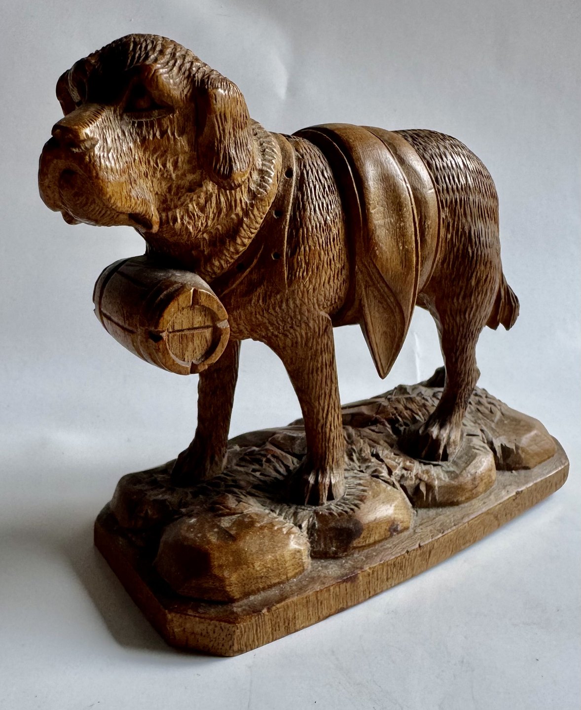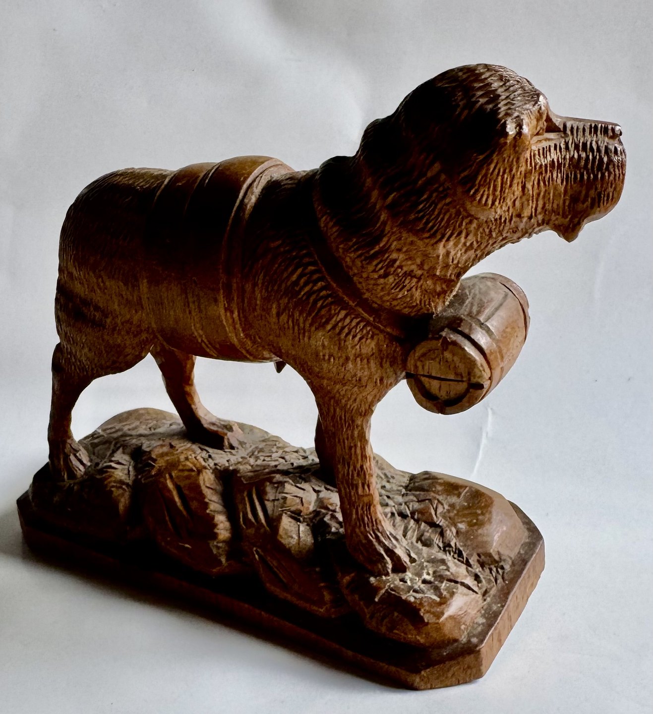 Udskåret figur i lindetræ forestillende en Sankt Bernard hund med den evige tønde i træ rundt om halsen. Fremstillet i Schweiz i begyndelsen af 20. århundrede. Fremstår i god stand uden skader eller reparationer. Mål: H. 12,5 cm. Basen måler 6,2 x 13,4 cm.v/ Jesper Reutemann