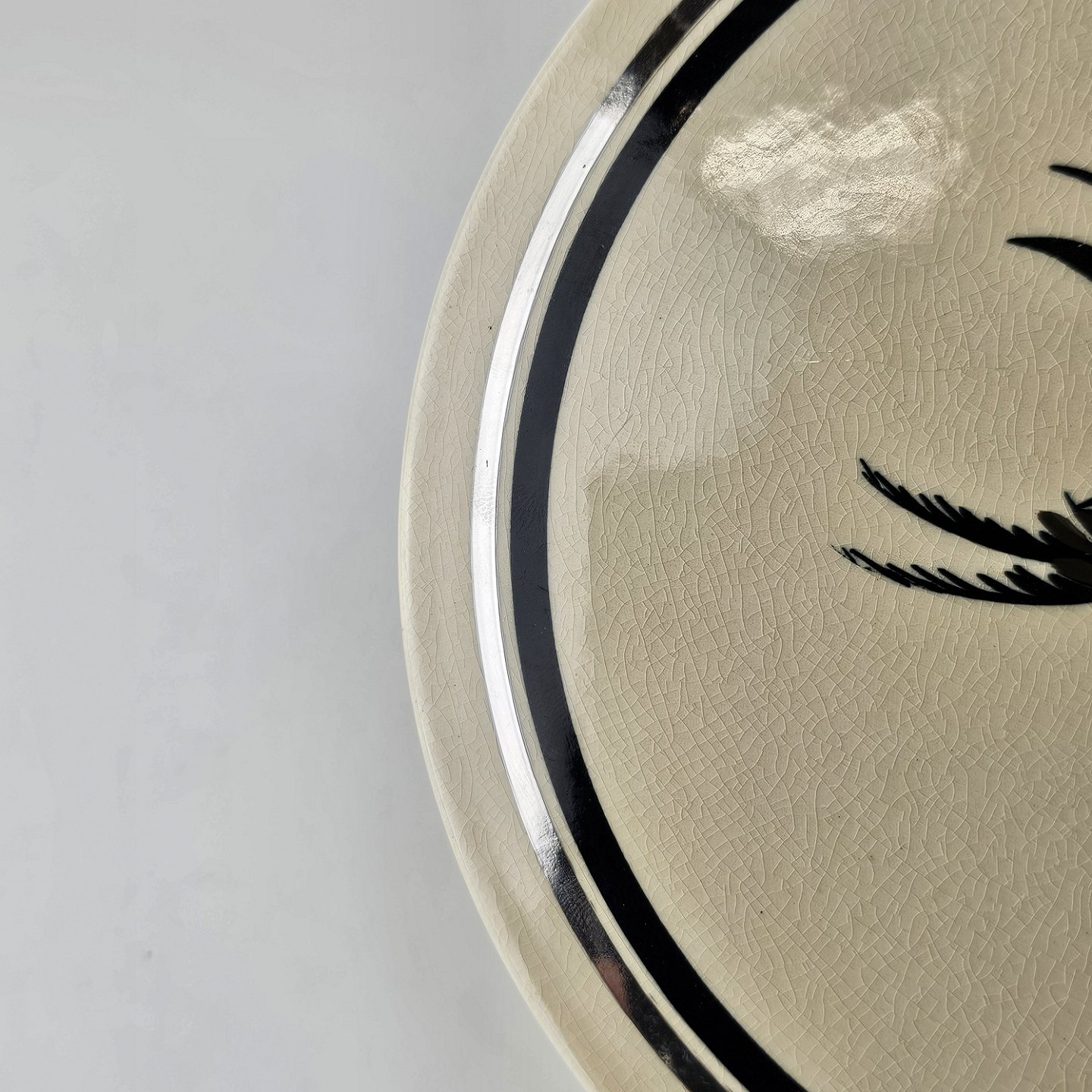 Råhvidt fajancestel i stelform E med dekoration af naturmotiver i sølv og sort farve.