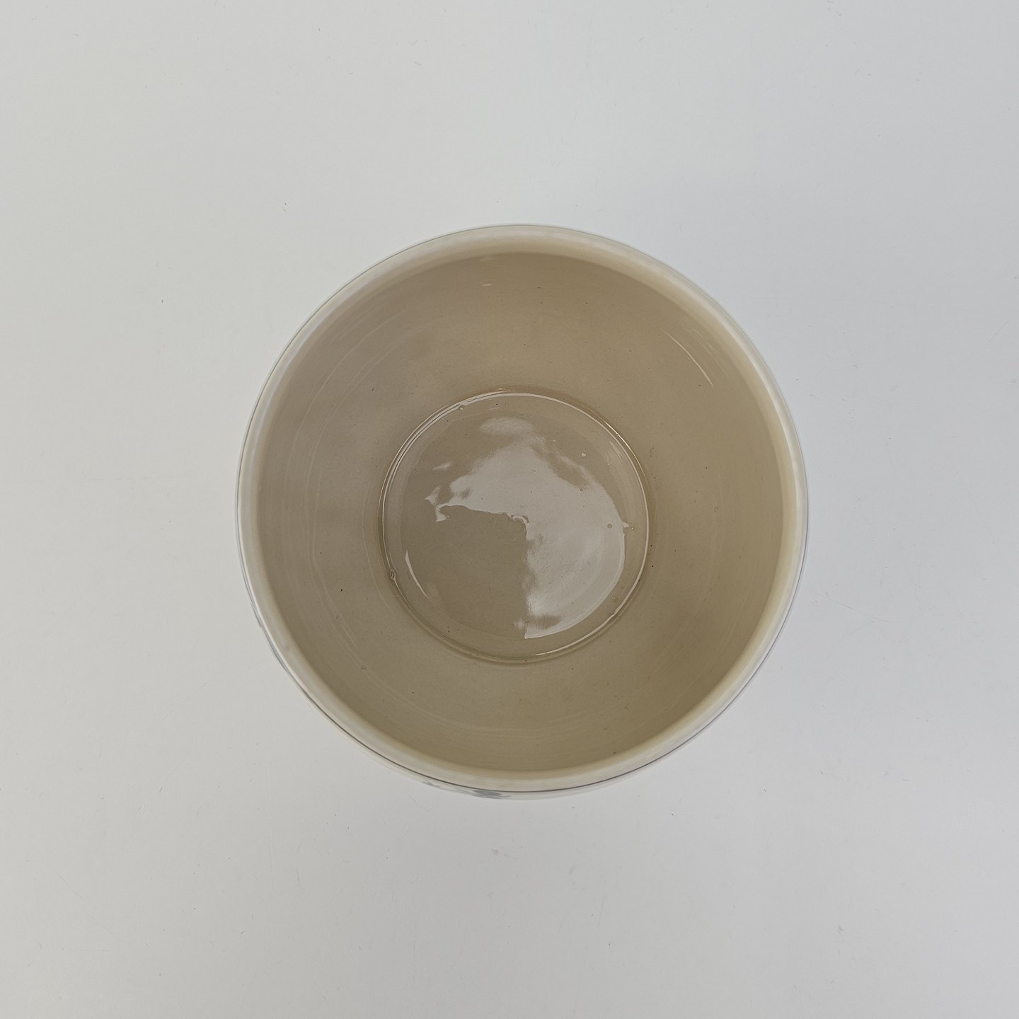 Råhvidt fajancestel i stelform E med dekoration af naturmotiver i sølv og sort farve.