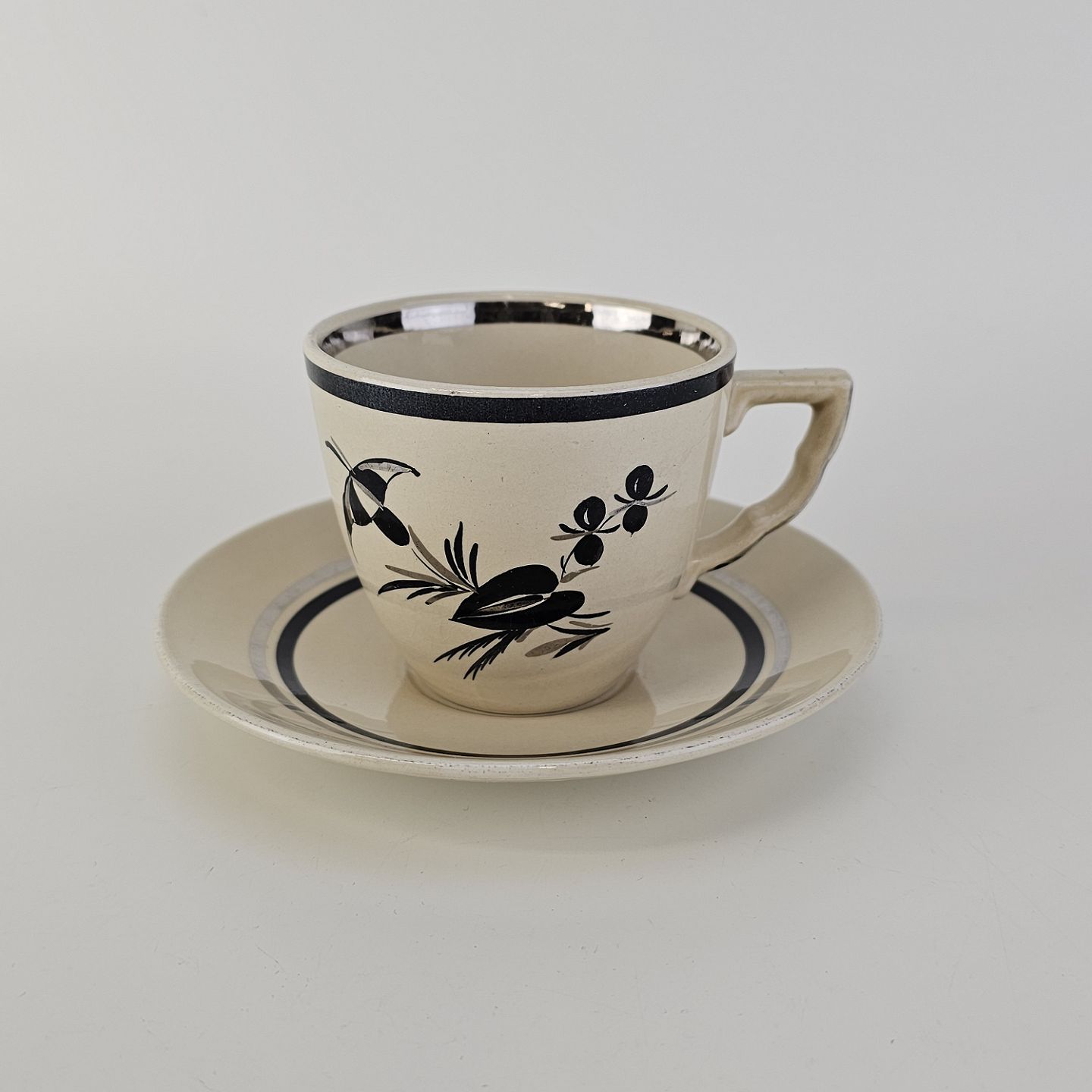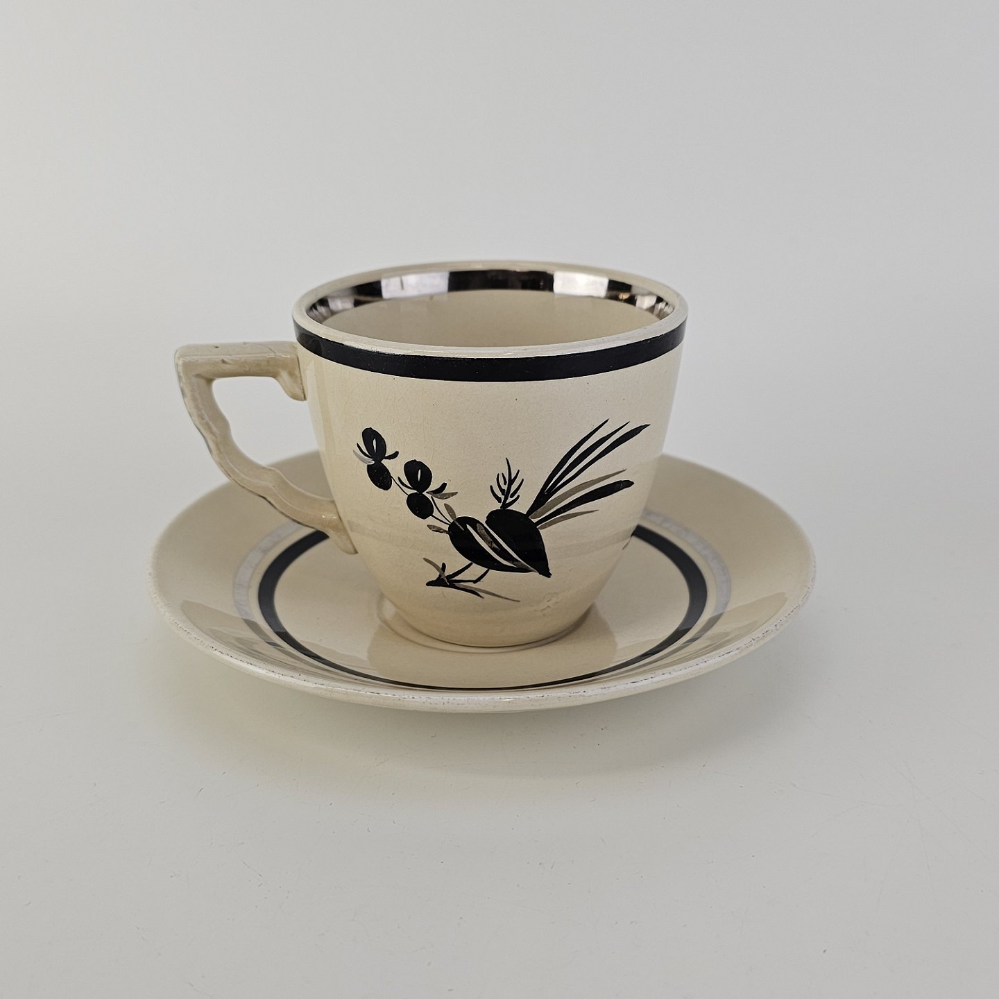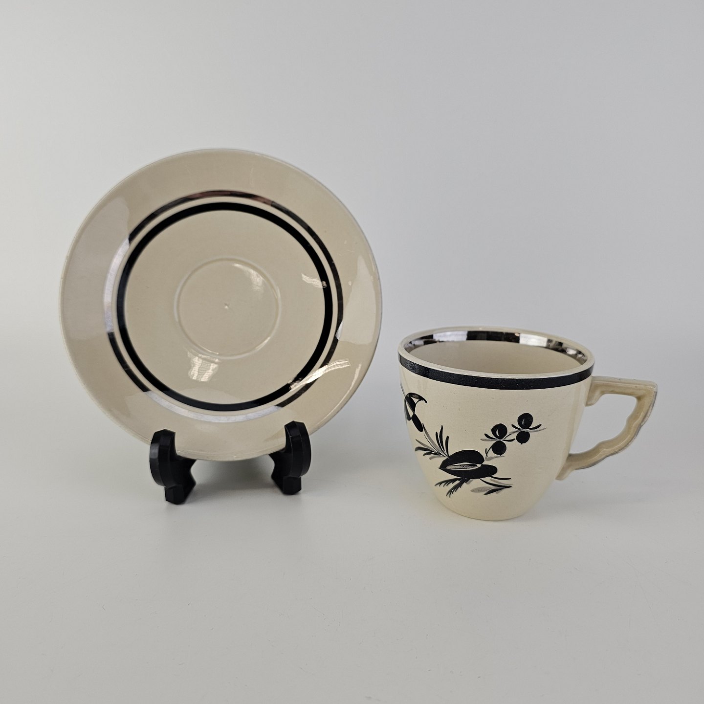 Råhvidt fajancestel i stelform E med dekoration af naturmotiver i sølv og sort farve.
