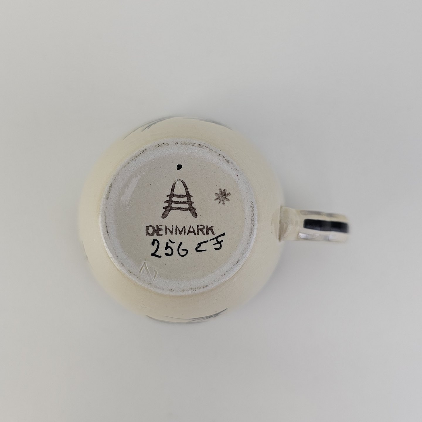 Kop med underkop med art nouveau hank i fajance fra stellet Dragsholm fremstillet i perioden 1934-1965.Formgiver Thorkild Olsen