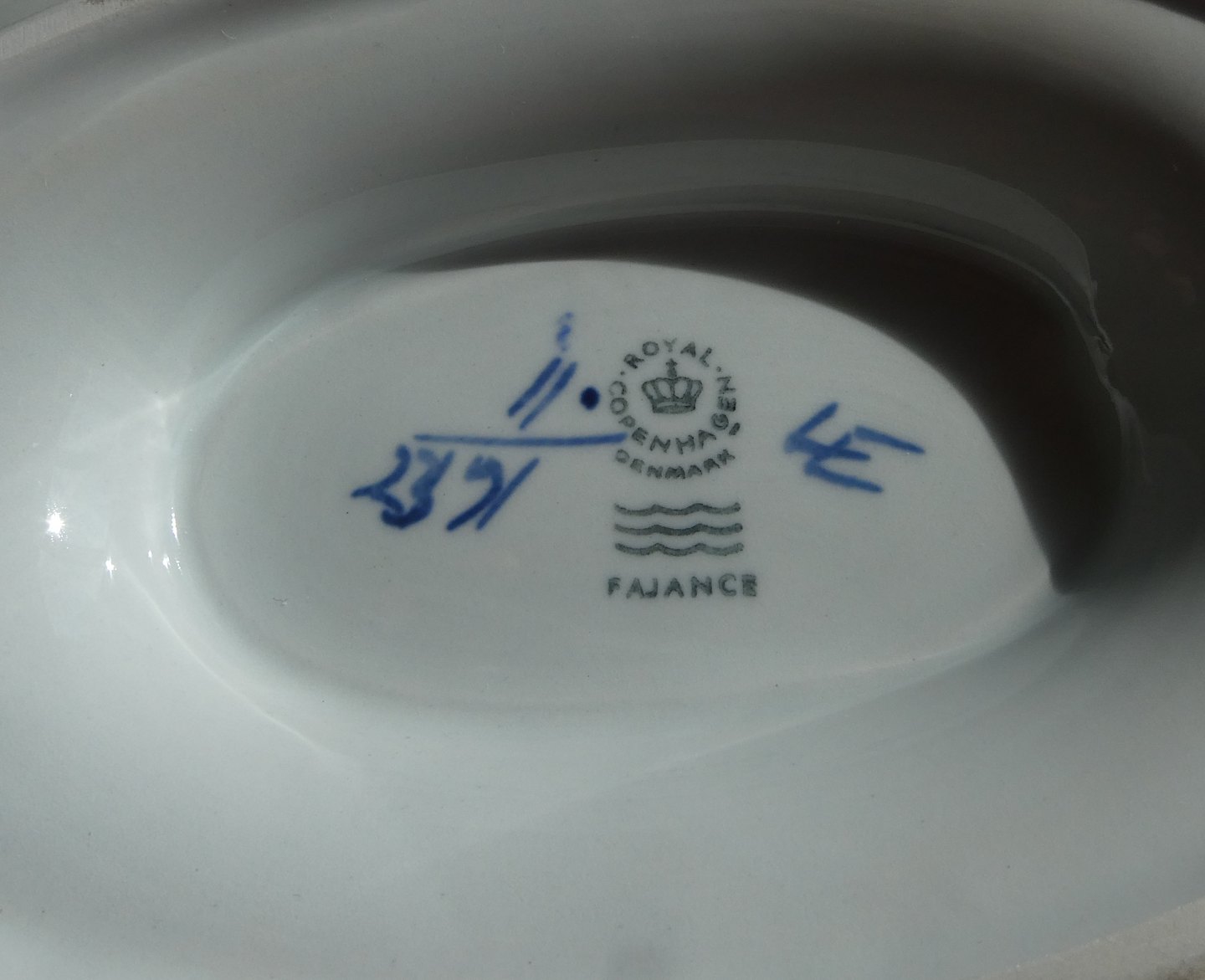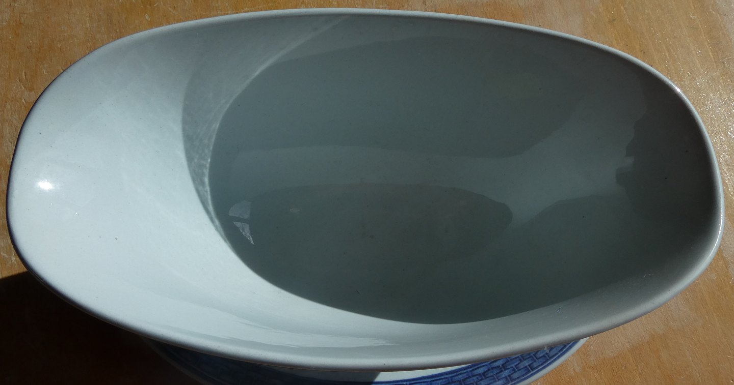 Tranquebar eller Trankebar fajance porcelæn fra Aluminia og Royal Copenhagen. Kongelig fajance porcelæn.Oval sauceskål eller sovsekande på fast fod nr. 2391 i 1.sort. og i pæn stand med almindelig brugsslitage.