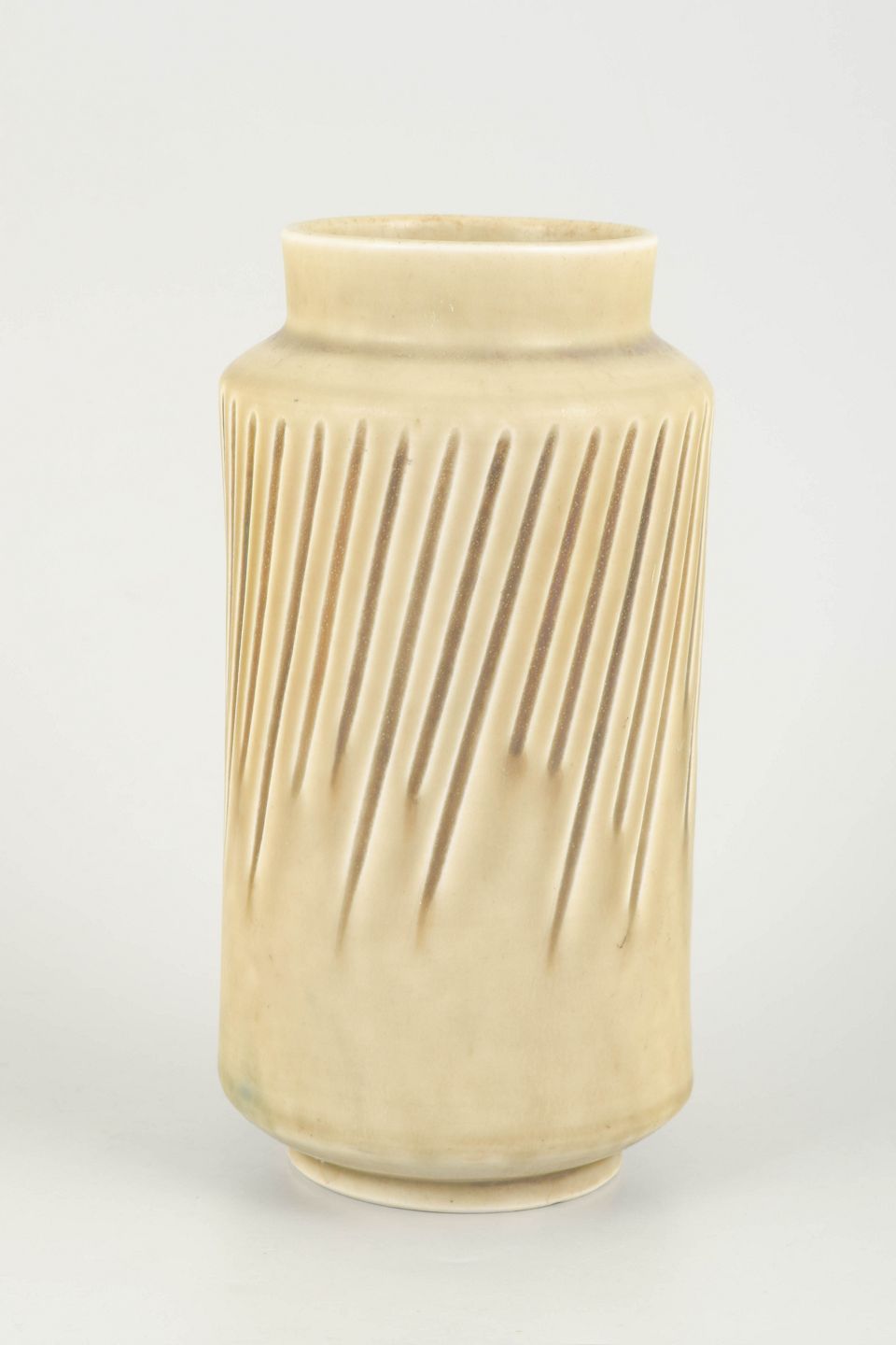Eva Stæhr-Nielsen for Saxbo, vase.Cylinderformet vase i stentøj med lodrette, diagonalt skårne reliefspor og ensartet, lys beige glasur. Stram og modernistisk form med markant struktureret overflade.