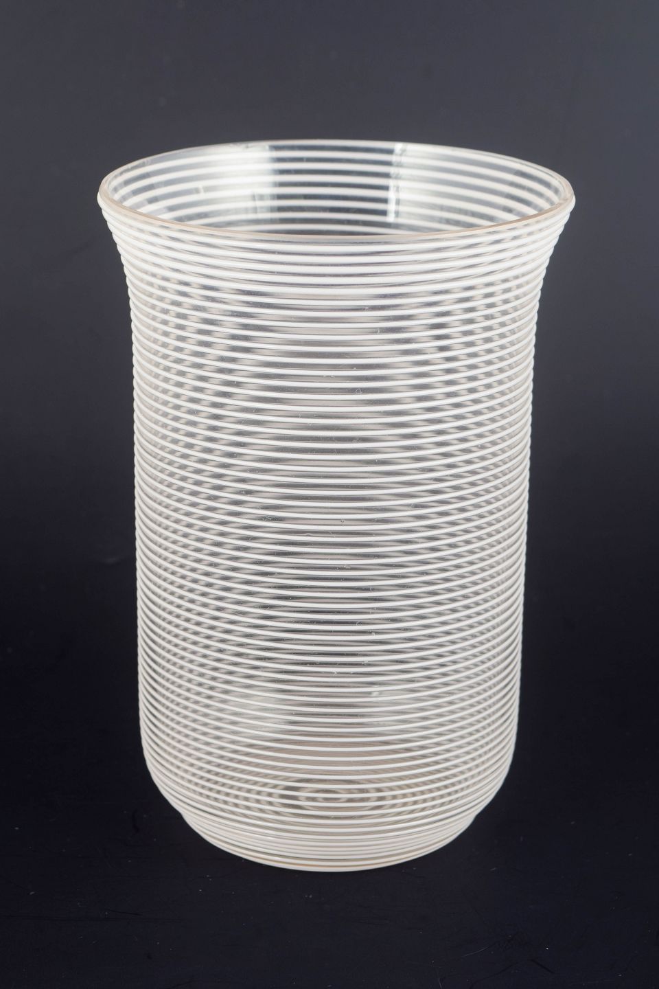 Europæisk studioglas, vase.Cylinderformet kunstglasvase i klart glas med tætliggende horisontale tråddekorationer, der skaber en struktureret og optisk vibrerende overflade.
