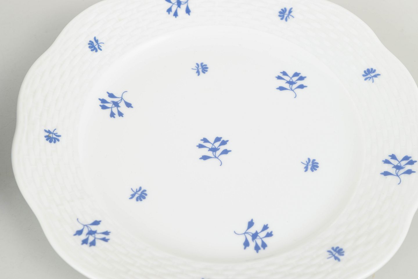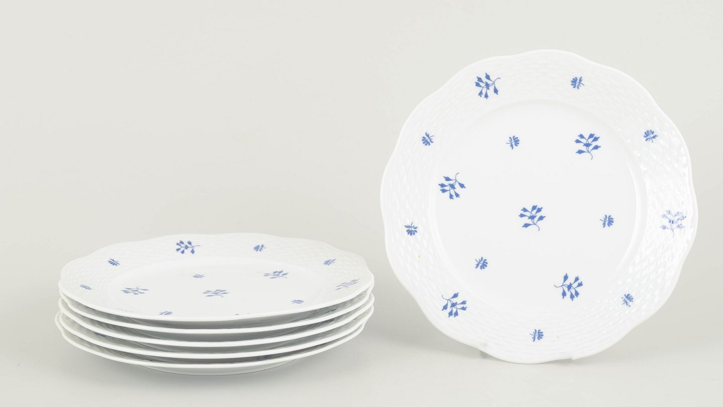 Herend, sæt af seks tallerkener.Elegant sæt af seks håndmalede porcelænstallerkener fra Herend med diskret blå blomstermotiv fordelt over fanen og midterfeltet. Den let bølgede rand og fine reliefstruktur giver en klassisk og raffineret fremtoning, karakteristisk for fabrikkens mellemkrigsproduktion. Et harmonisk og dekorativt stel i mindre format.