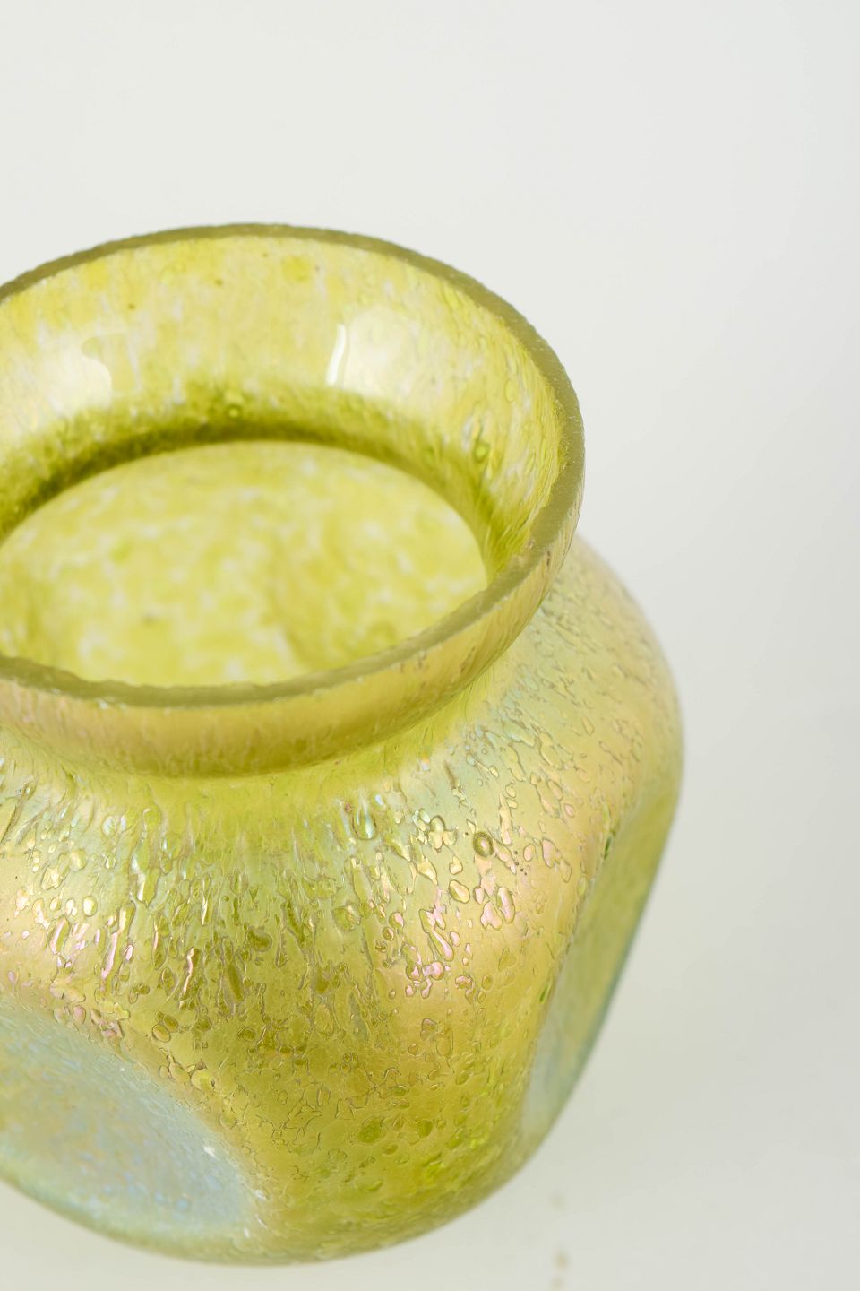 Loetz iriserende glasvase.Kompakt vase i mundblæst glas med kraftig iriserende overflade i gulgrønne og blålige nuancer. Den rundede korpus med let udadbøjet hals og subtile, organiske strukturer i glasset er karakteristisk for Loetz’ mellemkrigsproduktion, hvor levende farvespil og metallisk glans var centrale virkemidler.