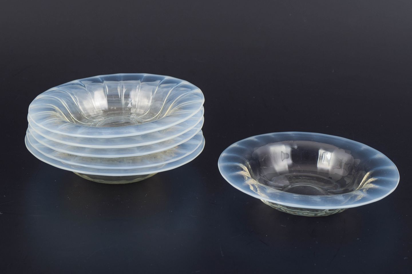 Sæt med seks små kunstglasskåle.Seks små kunstglasskåle udført i europæisk studioglas med klar, let rillet form og blødt buet profil. Skålene har en harmonisk, organisk silhuet og fremstår med elegant gennemsigtighed.