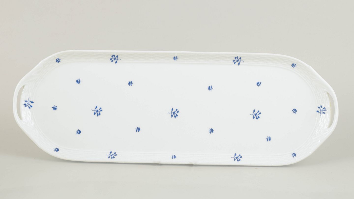 Herend, stort fad.Imponerende og elegant ovalt porcelænsfad fra Herend, udført med raffineret håndmalet dekoration og fin forgyldning langs randen. Fadet fremstår med klassisk proportionering og balanceret form, typisk for fabrikkens produktion i mellemkrigstiden. Et repræsentativt og dekorativt serveringsfad fra 1930’erne.