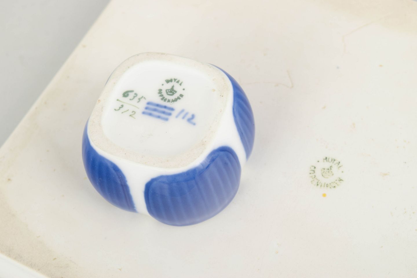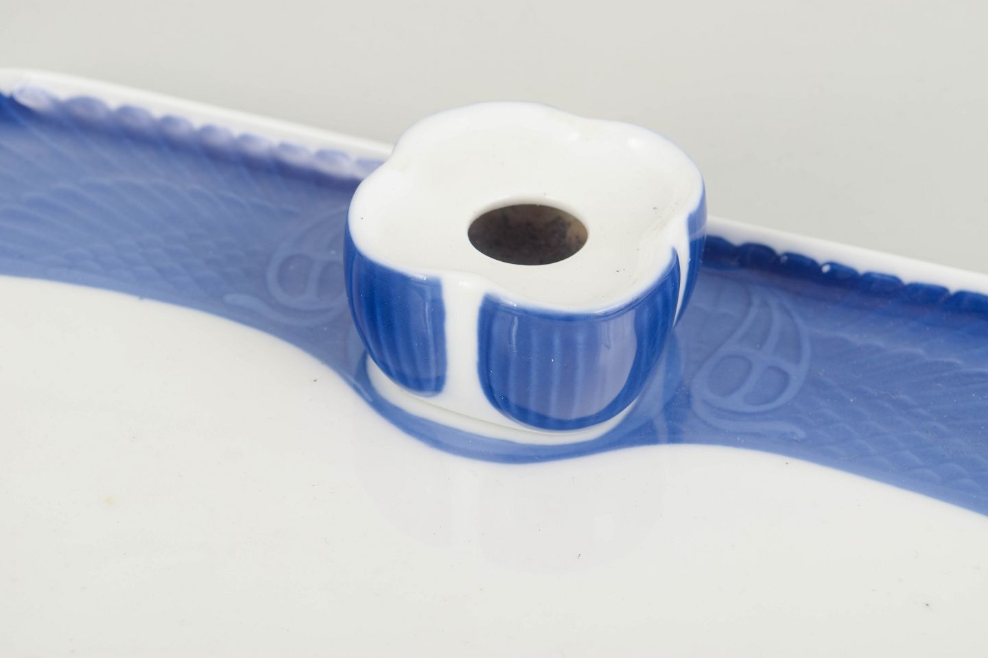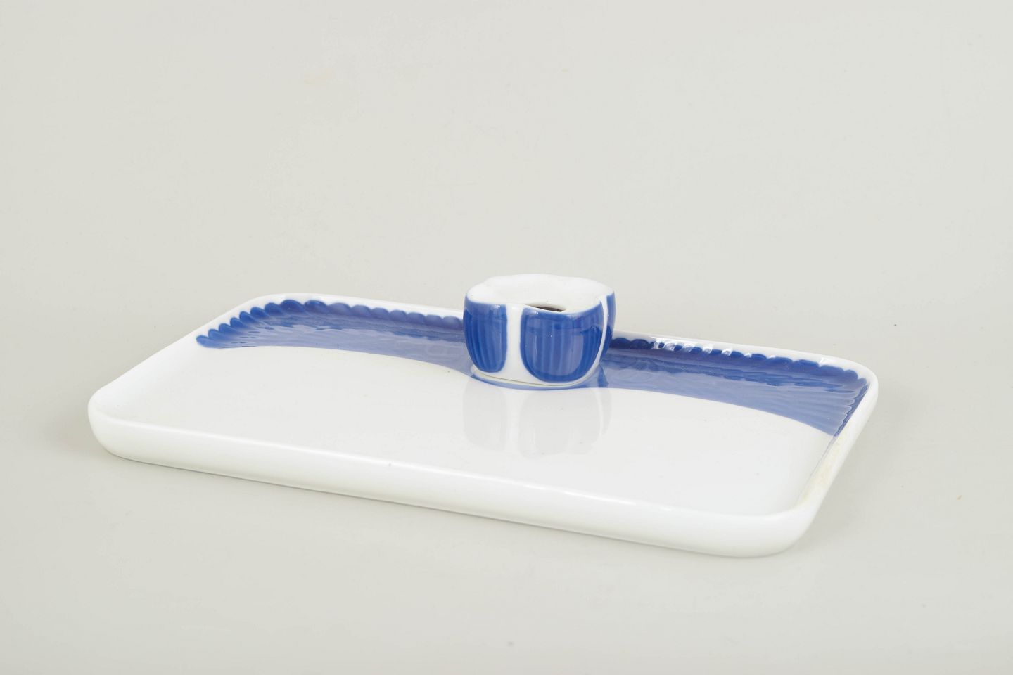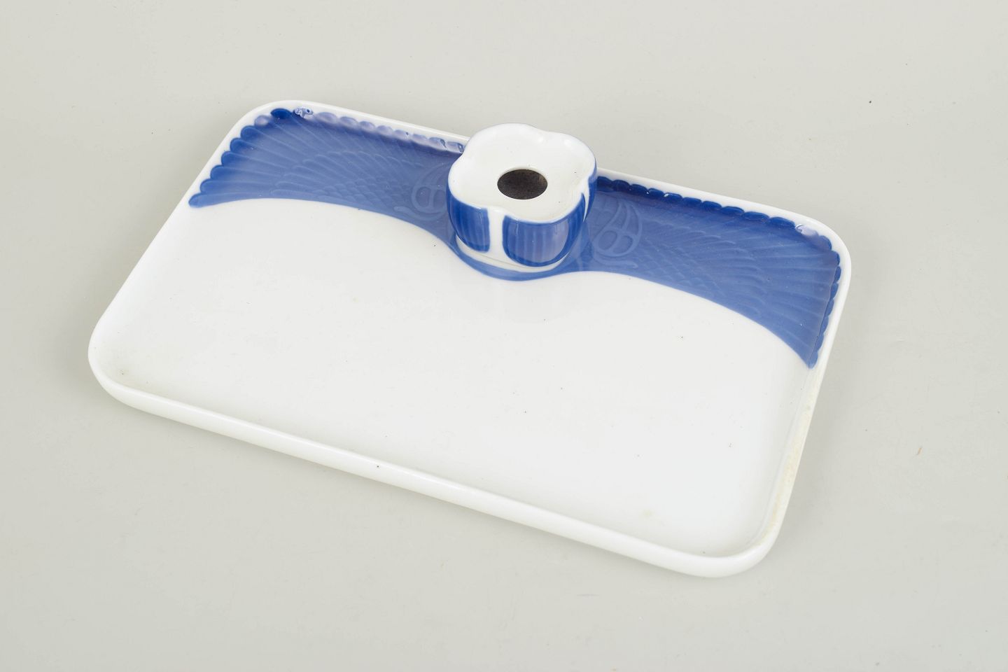 Royal Copenhagen Art Nouveau blækhus.Sjældent Art Nouveau blækhus i hvidt porcelæn med integreret firkantet blækindsats og dekoration i underglasurblå riflet bort.