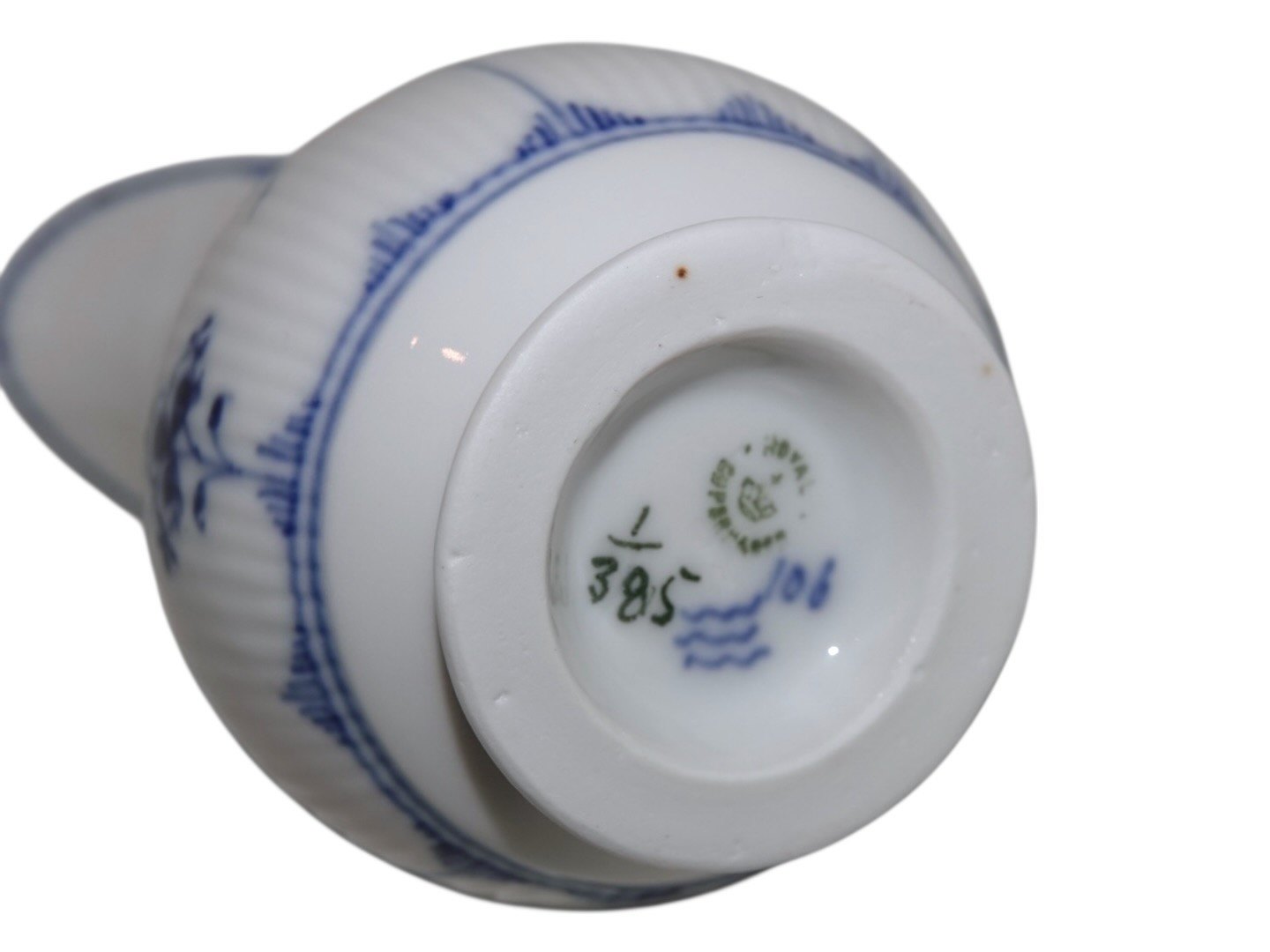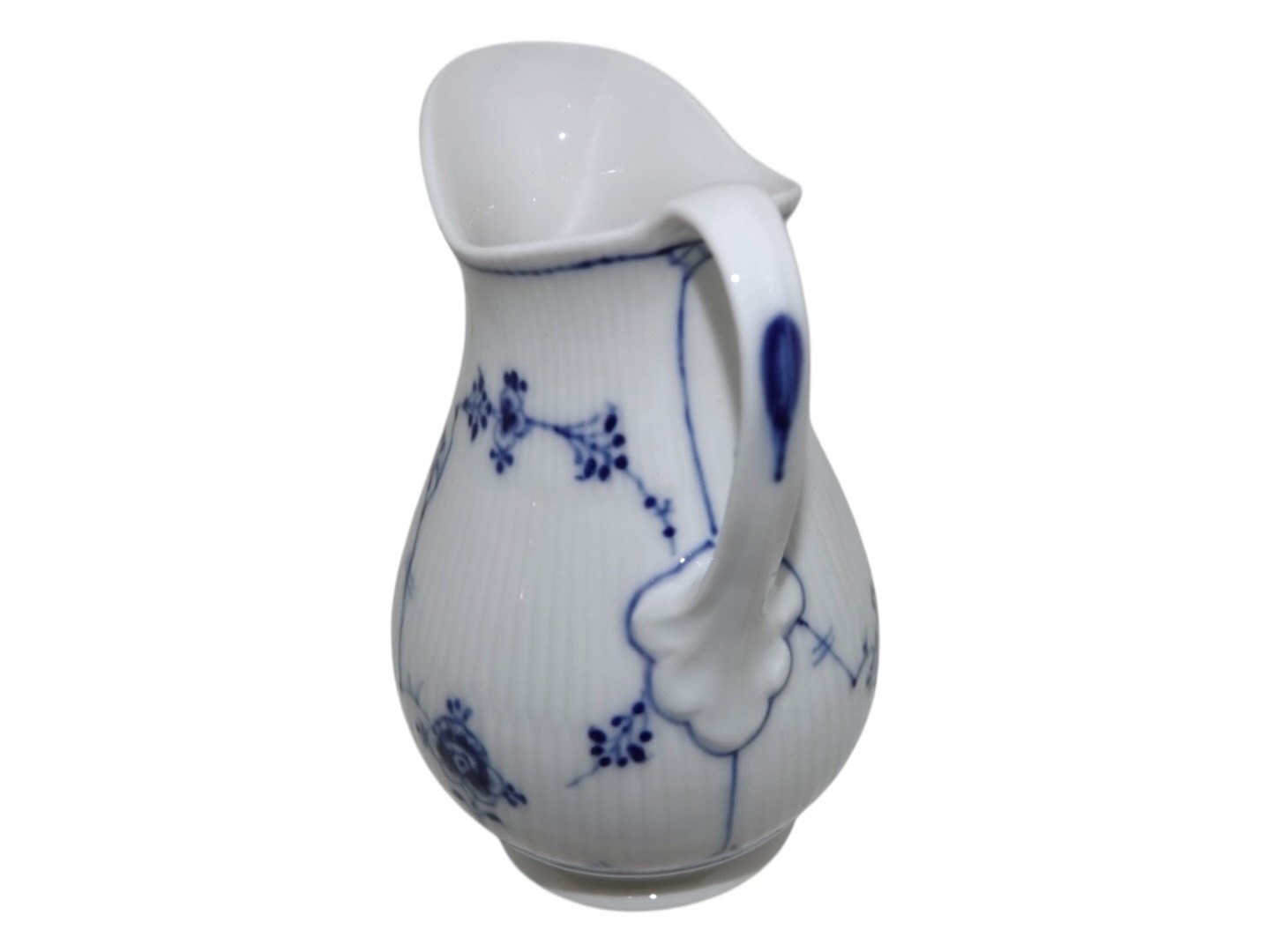 Royal Copenhagen Musselmalet Riflet, sjælden flødekande.Af fabriksmærket ses det, at denne er produceret mellem 1898 og 1923.