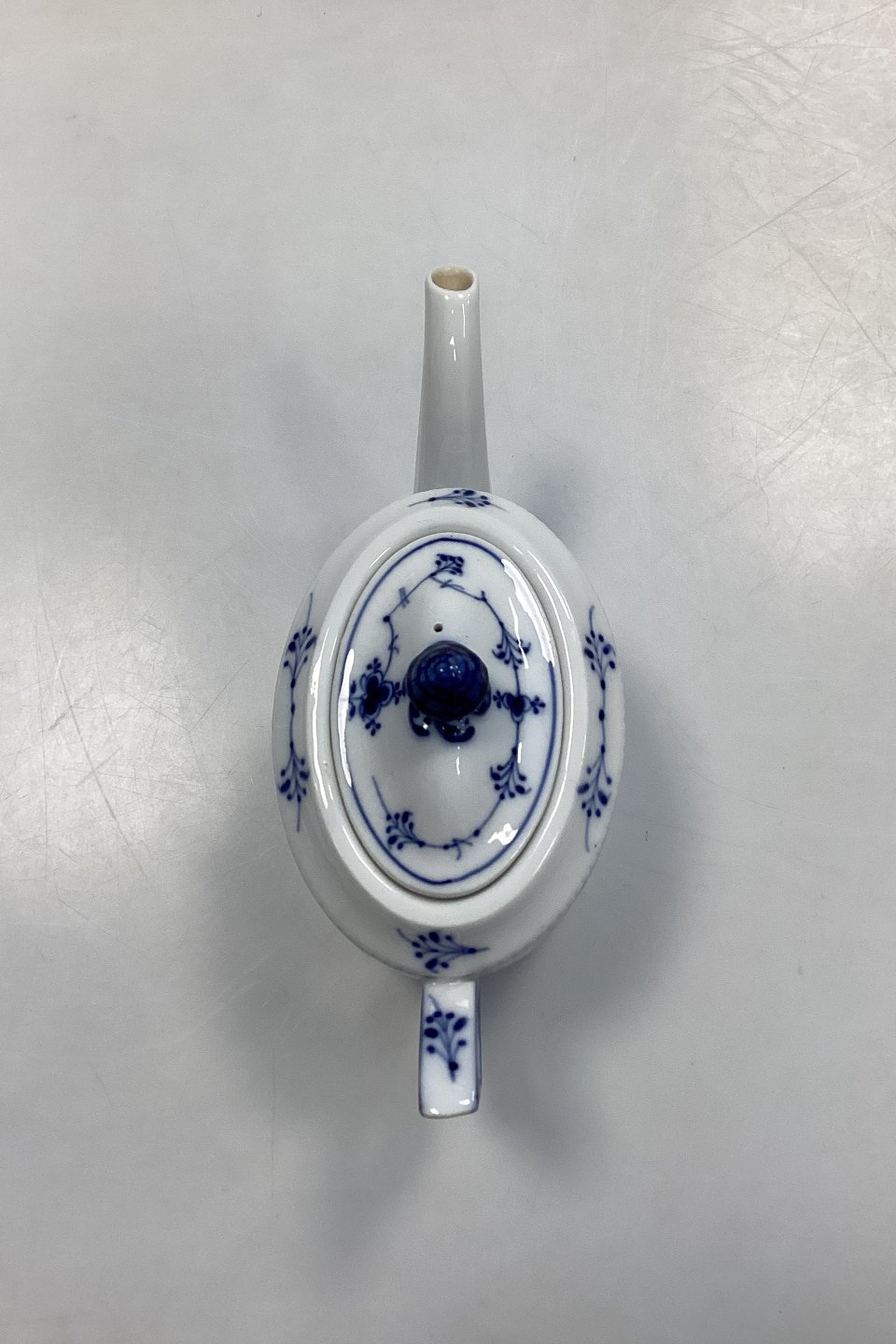 Royal Copenhagen Musselmalet Riflet Oval Tekande No. 253. Måler 9,5 cm / 3,74 in. i højden uden låg. Måler 12,5 cm x 9 cm / 4,92 in. x 3,54 in. uden hank og tud.1. Sortering i fin hel stand.