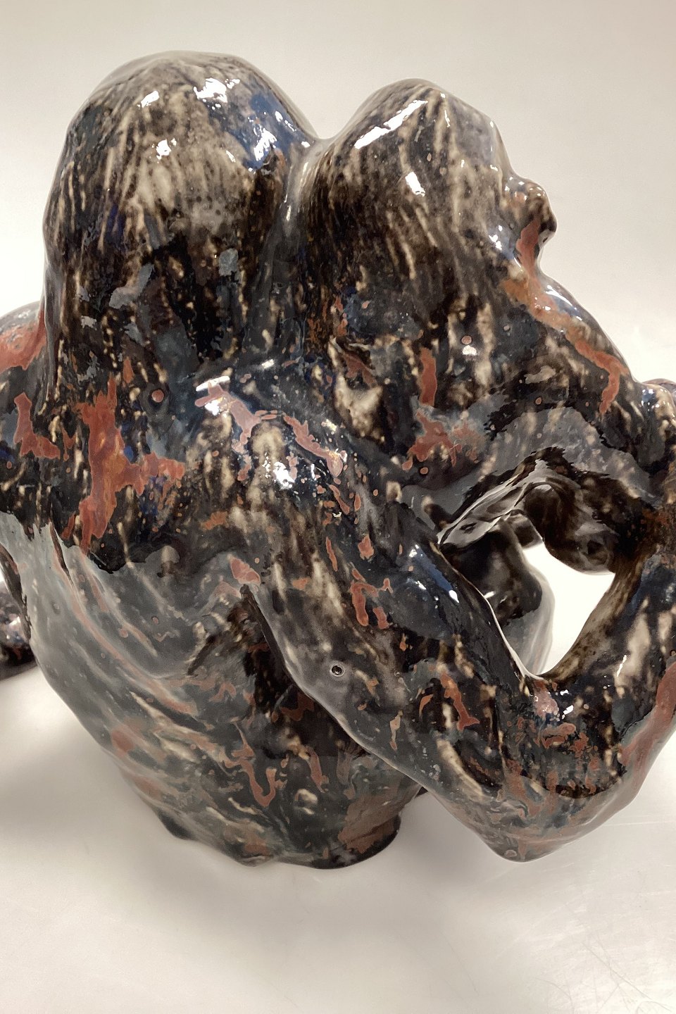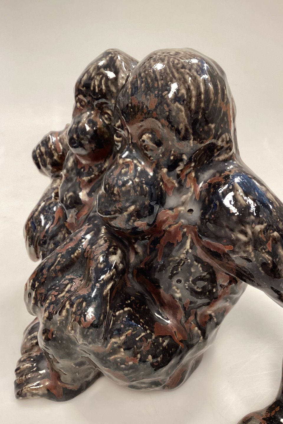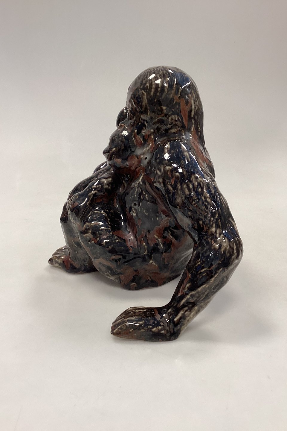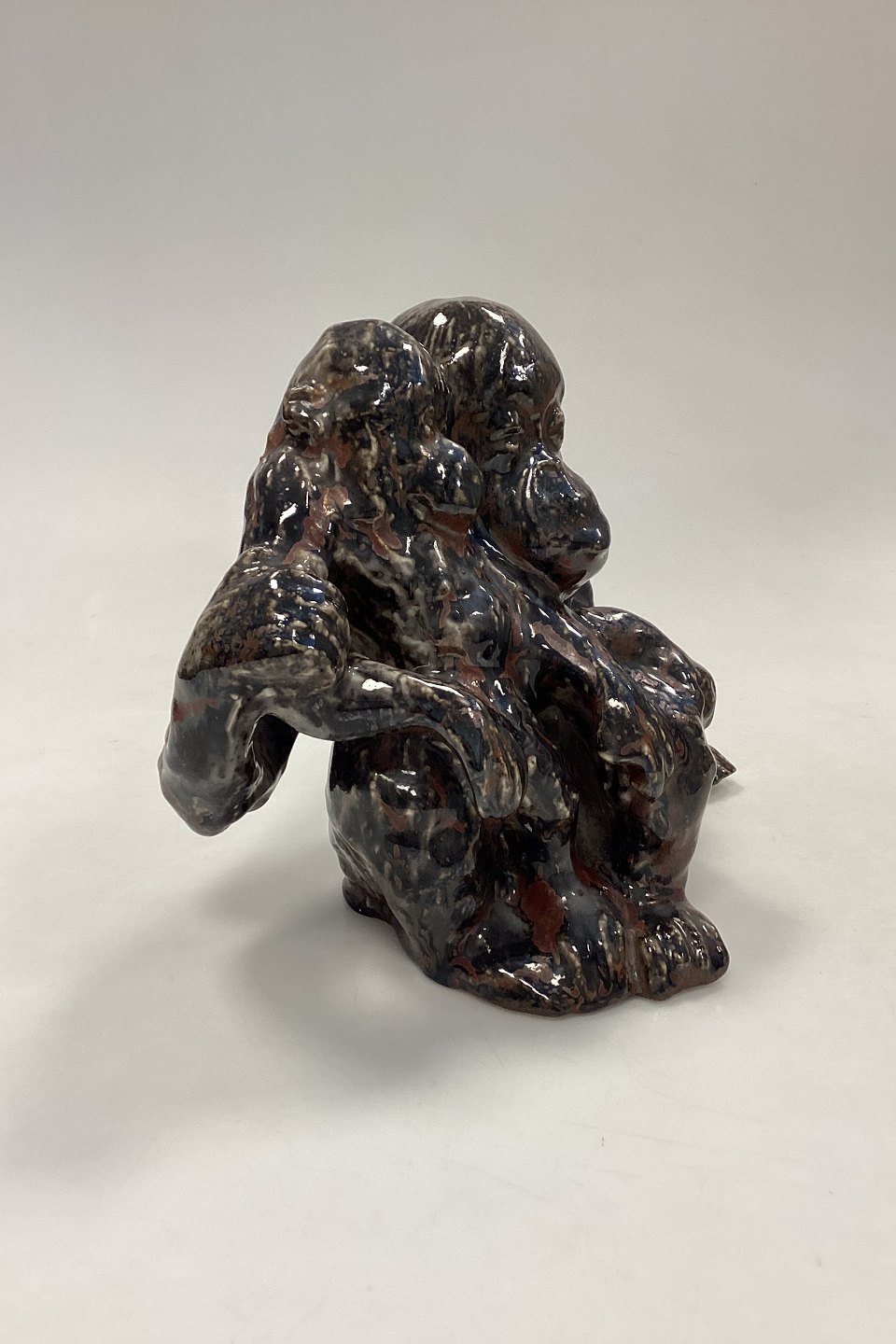 Bing og Grøndahl Stentøjsfigur - Orangutang/Abe med Unge af Knud Kyhn. Glasur i brun, blodrød og hvid. Der er 2 glasurhuller på abemors venstre side. Bunden er mærket med tallet 88.Måler 25 cm x 21 cm / 7,28 in. x 8,27 in.
