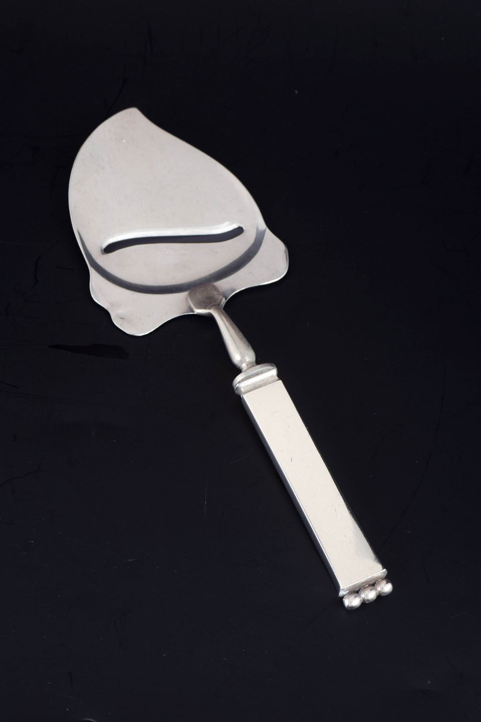 Evald Nielsen ostehøvl. Model nummer 27.Art deco ostehøvl i tretårnet sølv og rustfrit stål. Model nummer 27 med dekorativt skaft i relief med stiliseret blomstermotiv. Fremstillet hos Evald Nielsen.